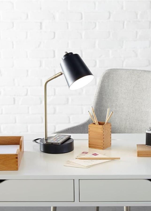 Looking to add more light to a work area? Keep your space uncluttered and well-lit by selecting a desk lamp with a base that doubles as a wireless charging station! One less gadget to fiddle with and no more awkwardly reaching behind furniture to find an outlet. We might be biased, but we particularly love the integrated LED in our Scott Living desk lamp with wireless charging—it will last up to 30 years!
