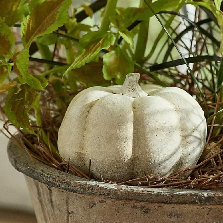 If you prefer a modern look, you might love contemporary accents made with natural materials like this. This cast concrete pumpkin brings an elegant and charming feel to any front porch. Group a few in different sizes next to your door or tuck them into planters to add interest. One happy reviewer called it the “perfect accent for fall decor,” while another loves the “earthy vibe.”