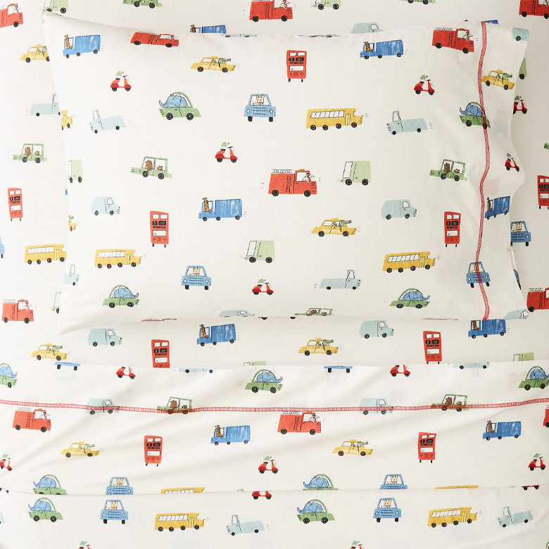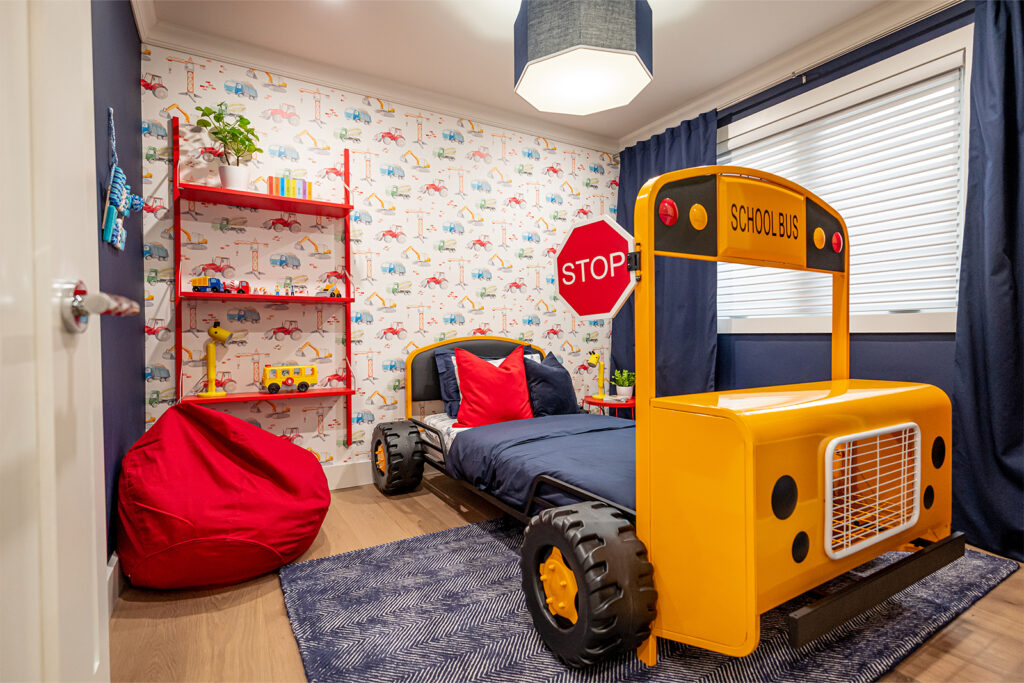 If your little one is always playing with trucks and tractors, it’s a great excuse to take their favorite toys and make a whole theme out of them! A fun car-shaped bed and sprinkled motifs of buses and trucks throughout make for a seriously cool kids’ bedroom that’s both creative and cute.