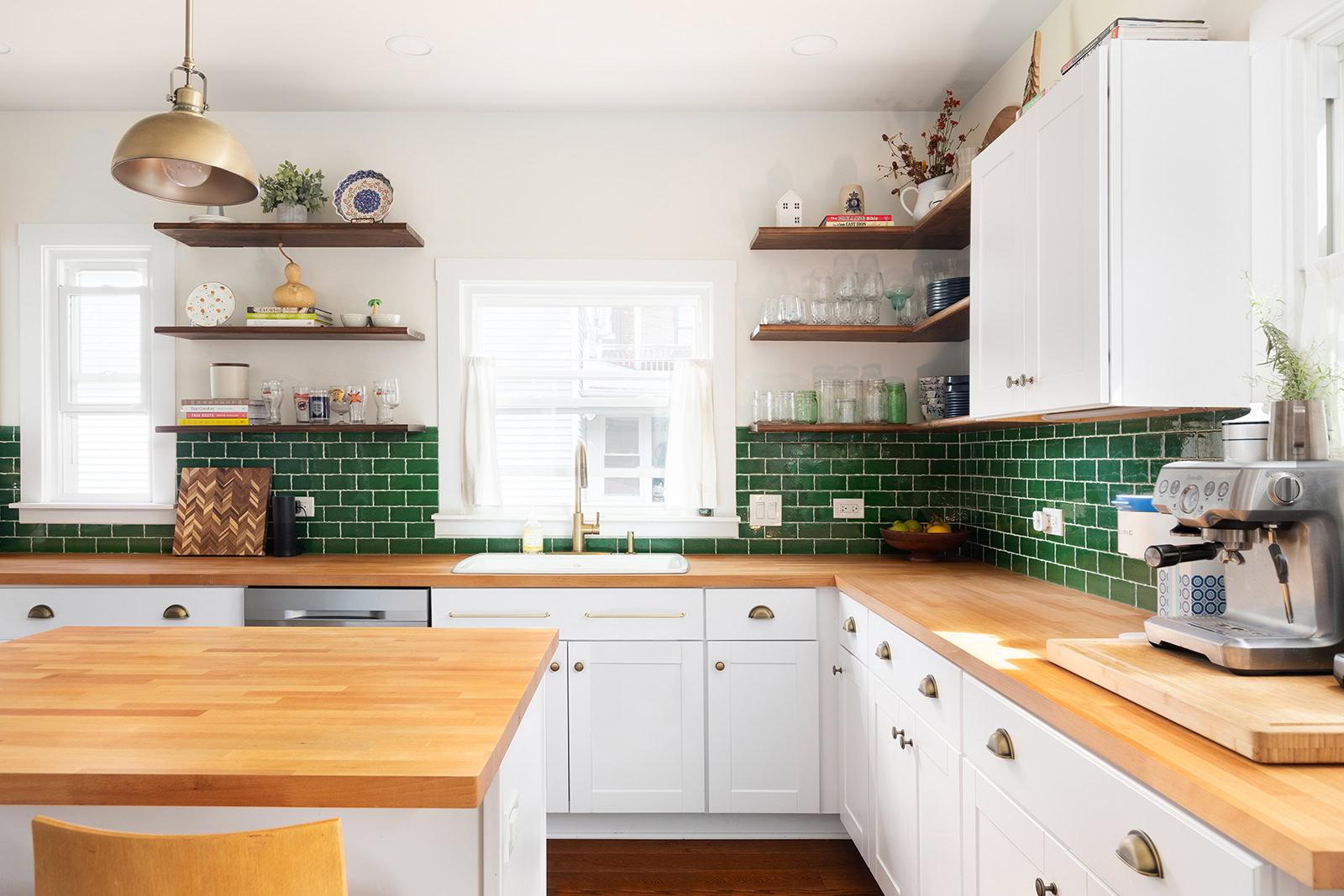 Green subway tile blends a trendy color with a classic shape. However, not all greens are created equal. Pick a shade that can act as a neutral design element, and steer clear of brighter, louder-looking tones like Kelly green. “If you picture a rainbow with bright colors, those are not the colors you want for your backsplash,” Andi says.