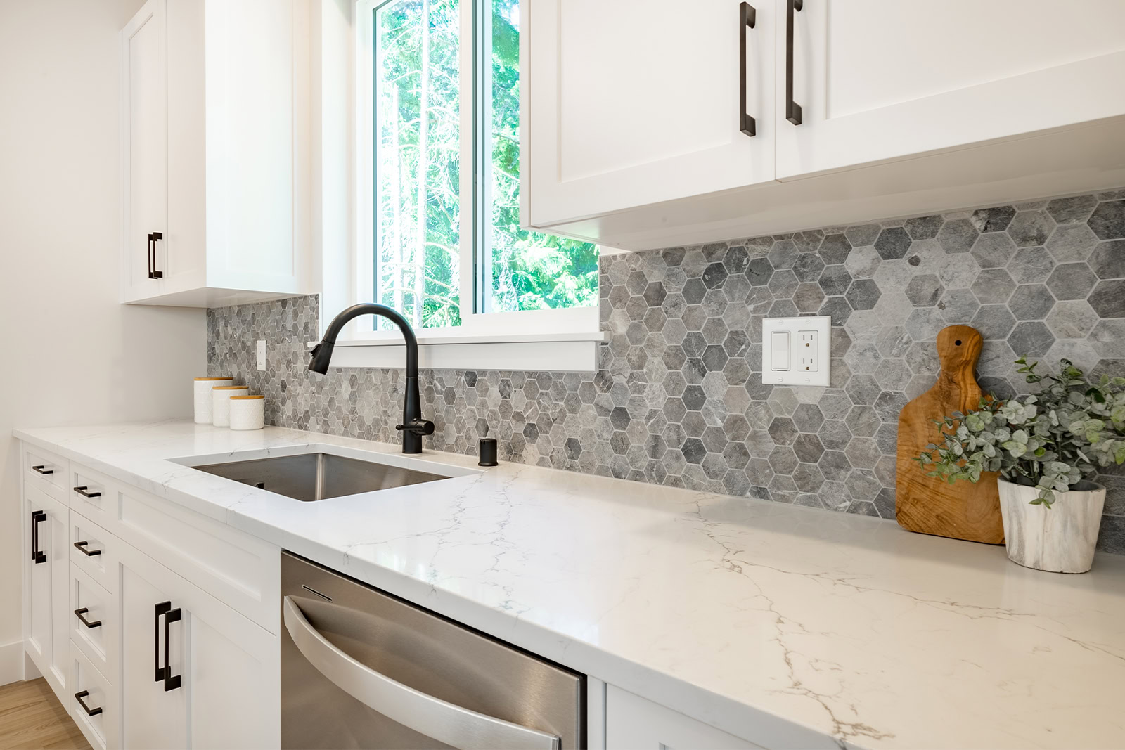 Grey penny tile looks like oversized gray pennies connected by grout. While grey penny tile can appear very chic and hide dirt better than standard white tile, it also uses a lot of grout, which means it will take longer to clean than backsplashes with larger tiles. “Penny tile is going to get really dirty really quickly and be a pain to clean,” Andi says. “I would save it for a bathroom or laundry room.”