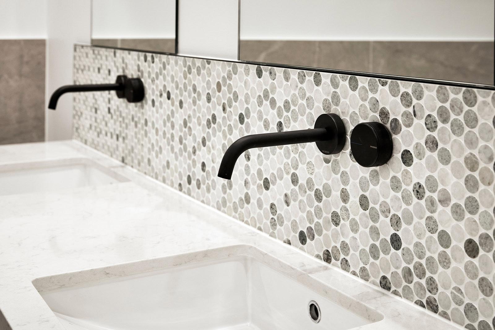 Since hexagon and penny tiles come on a sheet of mosaic mesh, make sure you hire a skilled expert to do the installation. Andi adds, “If you don’t get the spacing right from one sheet to another, then the tiles won’t line up properly.”