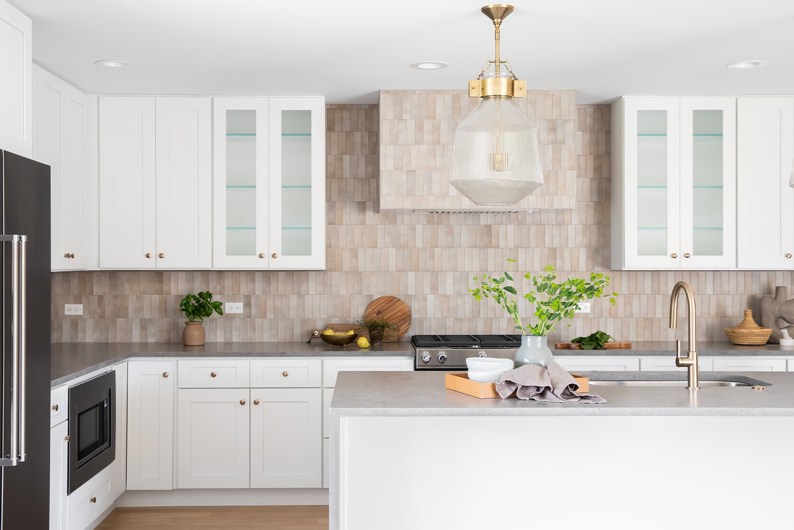 A backsplash in shades of white is a fantastic option if you’re going for a bright, classic look. “White tiles walk a fine line between being timeless and boring,” Andi says. “If you’re going to go with white, look for something that makes it more interesting, whether it’s an unexpected texture or variations in color and shape.” And if you think that all whites go together, think again. “They don’t have to match, but they can’t clash.”