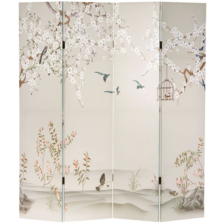 This gorgeous, ornate room divider screen is a piece of art and a functional addition all in one. Double-sided and 6 feet tall, the screen features stunning painterly birds and plum blossoms. It pairs beautifully with a ruffle-hem chair in a feminine pied-à-terre.