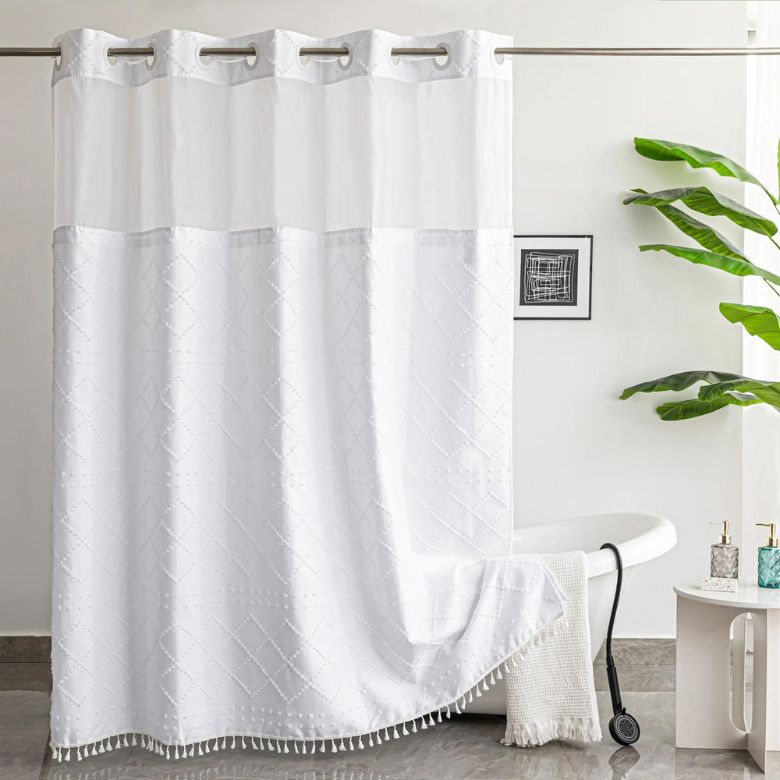 Also think about who will be using the shower—will you be bathing pets and children? In that case, something washable and durable is a must. Or maybe it will hang in a rarely-used guest space and you can get away with a more luxurious fabric. When considering budget, do you prefer a shower curtain that will stay put for years or do you like to switch it up with the season? These are all important factors when choosing the best shower curtain for you. That’s why we’ve curated a list of best-selling and high-rated shower curtain options that’ll check all the boxes.