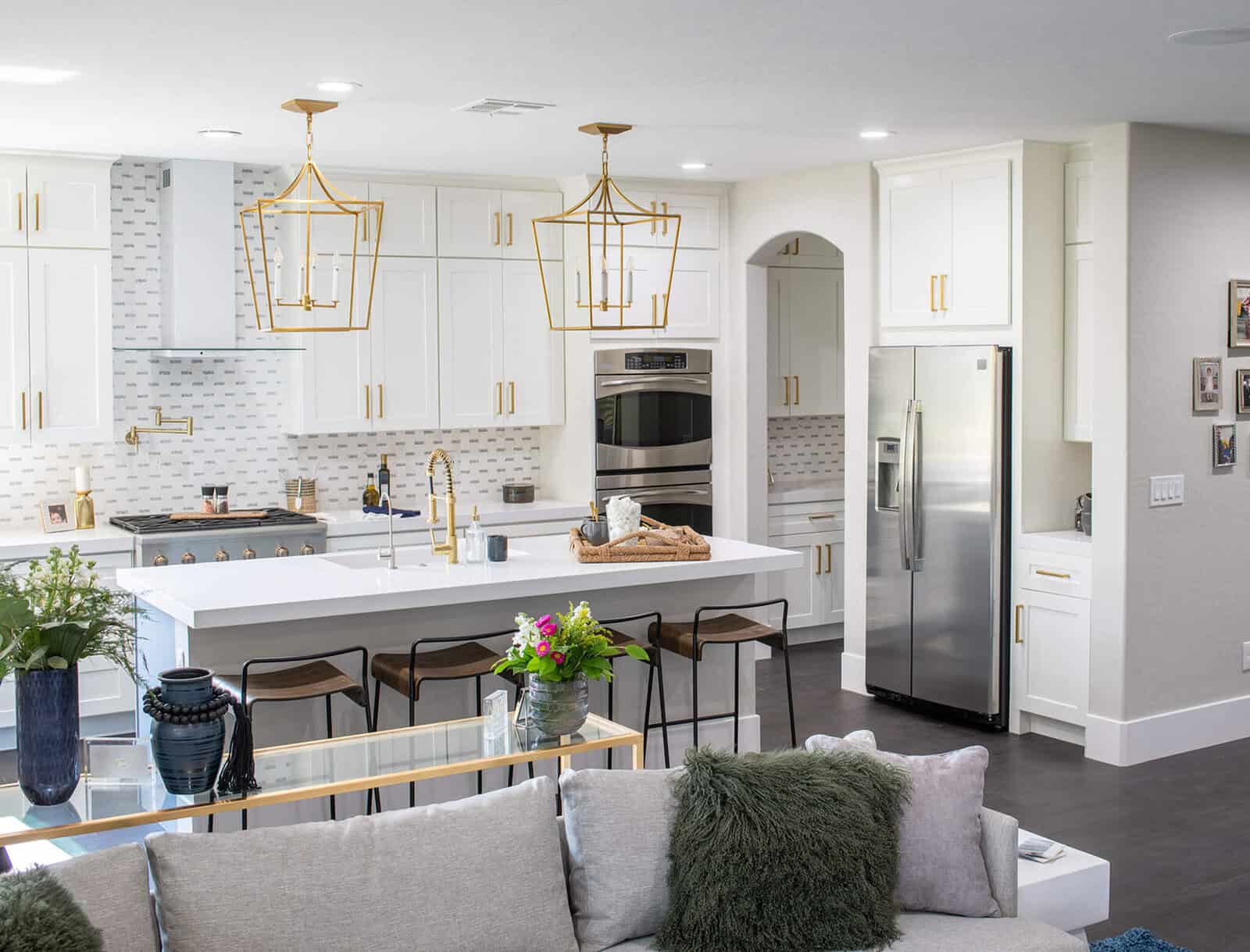 With so many kitchen renovations under the Drew and Jonathan’s (tool)belts, we decided, what better time to show off some of our favorite white kitchen ideas? From striking modern kitchens to glamorous-looking rooms with gold finishes, to cozy white cooking spaces that boast natural wood finishes, you might be surprised to see how different each of the looks are. Get ready to be inspired for your next kitchen makeover! But if you are looking for something bold, may we suggest green kitchens?