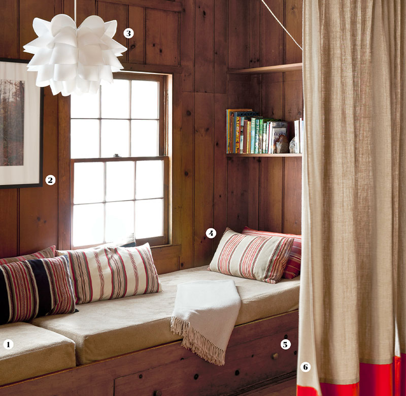 Having a place to stash extra throw blankets and pillows makes getting cozy in your nook a lot more convenient. Building in storage, like the drawers shown here, is a great way to utilize the space, but a large basket or trunk works, too. There are also plenty of ways to get creative when you’re short on square footage. Baskets and bins, cabinets and armoires, and even storage ottomans work great for small spaces, for example.
