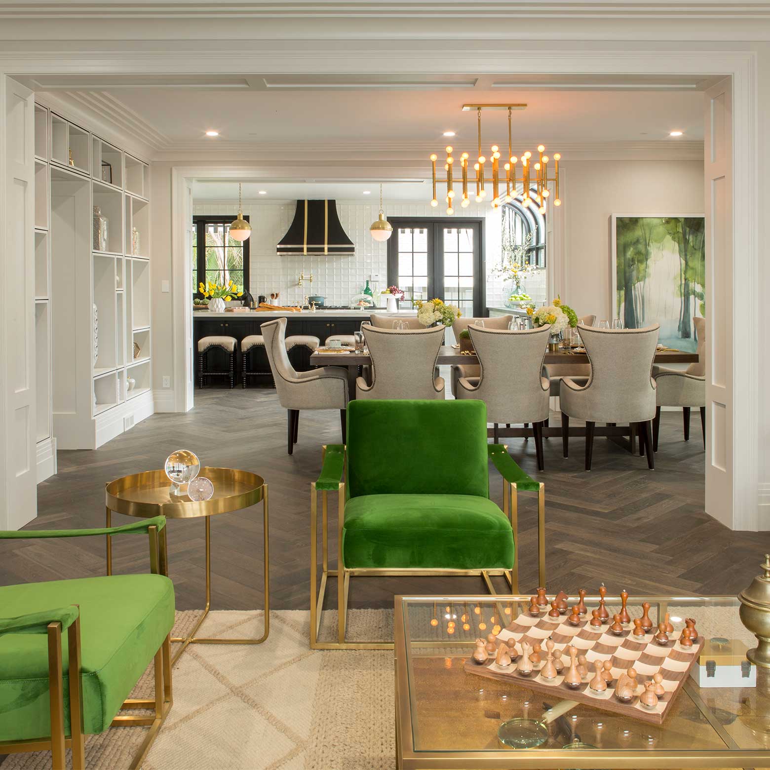Let’s say your living room and dining room are connected. You’ll want to make sure that some elements of the room are showcased in the other. Just like how we see the green painting peek through Drew’s dining room here—it calls back to the bold green chairs featured in the living room. This creates a harmony, where each room feels visually connected to the other, and makes for a space that looks more intentionally designed.