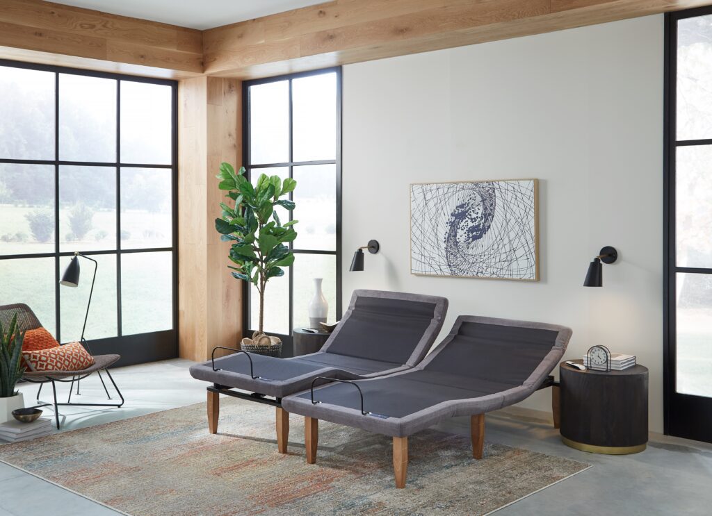Finally, you’ll want a sturdy frame to tie everything together. Don’t be afraid to go modern with a low platform bed. The luxuriously padded headboard makes it easy to read and relax while sitting up. If you’d rather prop yourself up, then an adjustable bed frame is the way to go.