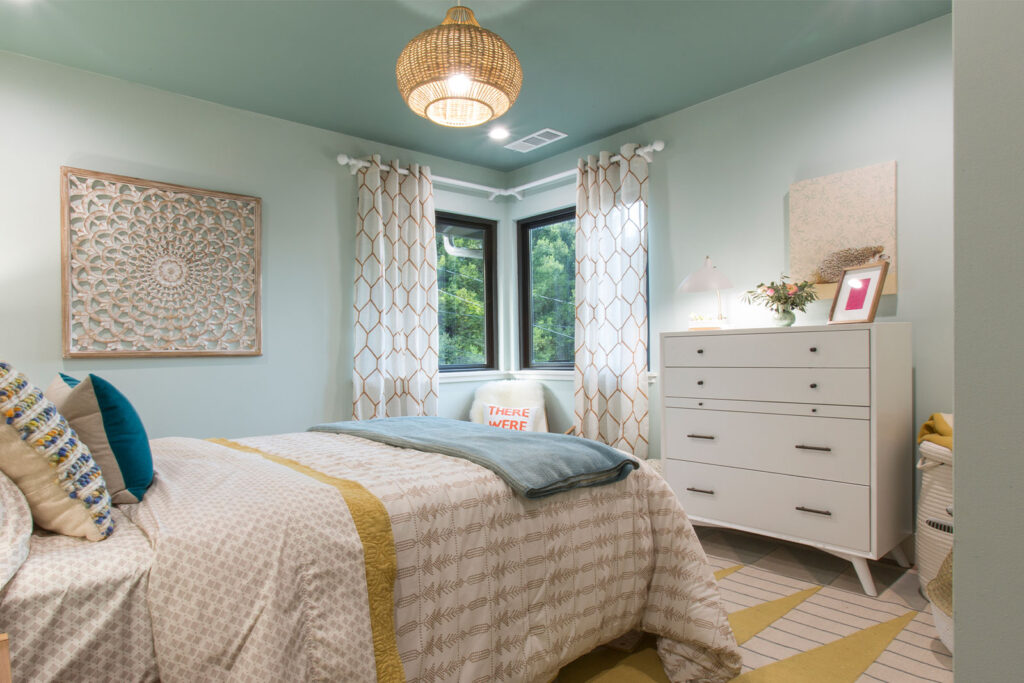 In the same season of Brother vs. Brother, Drew was seeing green in one of his guest bedrooms. He opted for a light turquoise shade on the walls, and went a touch darker on the ceiling for a cool contrast—he actually painted and repainted, finally finding perfection in Benjamin Moore Grenada Villa. This soothing shade would also look good in a powder room with dark accents or splashed across a freestanding cabinet for a pop of color.