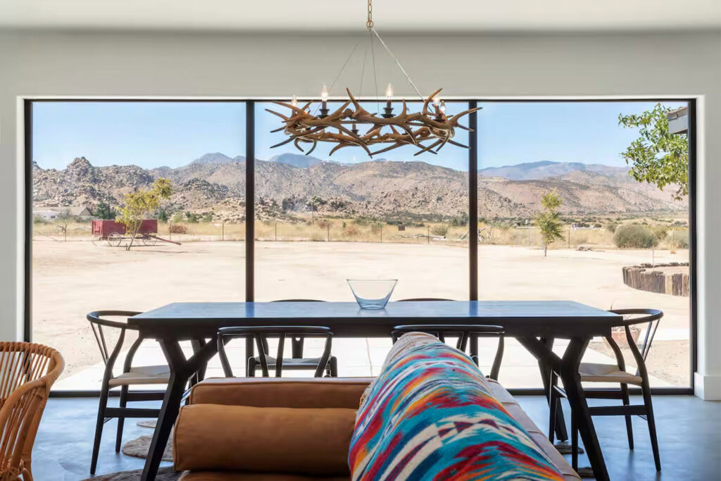 Earning a Top 5% badge on Airbnb for its high rankings in ratings, reviews, and reliability, the Pioneertown Lodge is a sought-after rental home that provides more than just a relaxing spot to lay your head. It also offers a slurry of modern amenities and unbelievable views. Right outside your large sliding glass doors off the dining room, you’ll find the peaks of the Sawtooth Mountains.