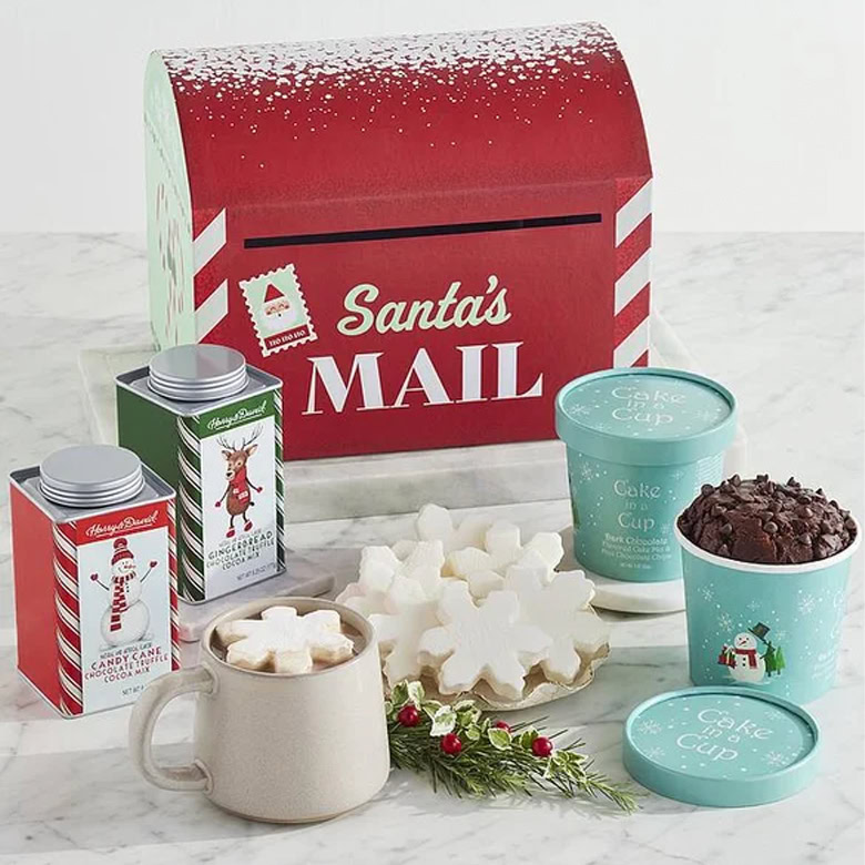 This Christmas gift basket looks as festive as it tastes! Plus, adorable holiday packaging in the shape of Santa’s mailbox makes it even more fun for your loved one to open. Inside this hot cocoa gift basket, they’ll find gingerbread cocoa mix, candy cane peppermint cocoa mix, two dark chocolate instant cake cups, and eight snowflake-shaped marshmallow cocoa toppers.