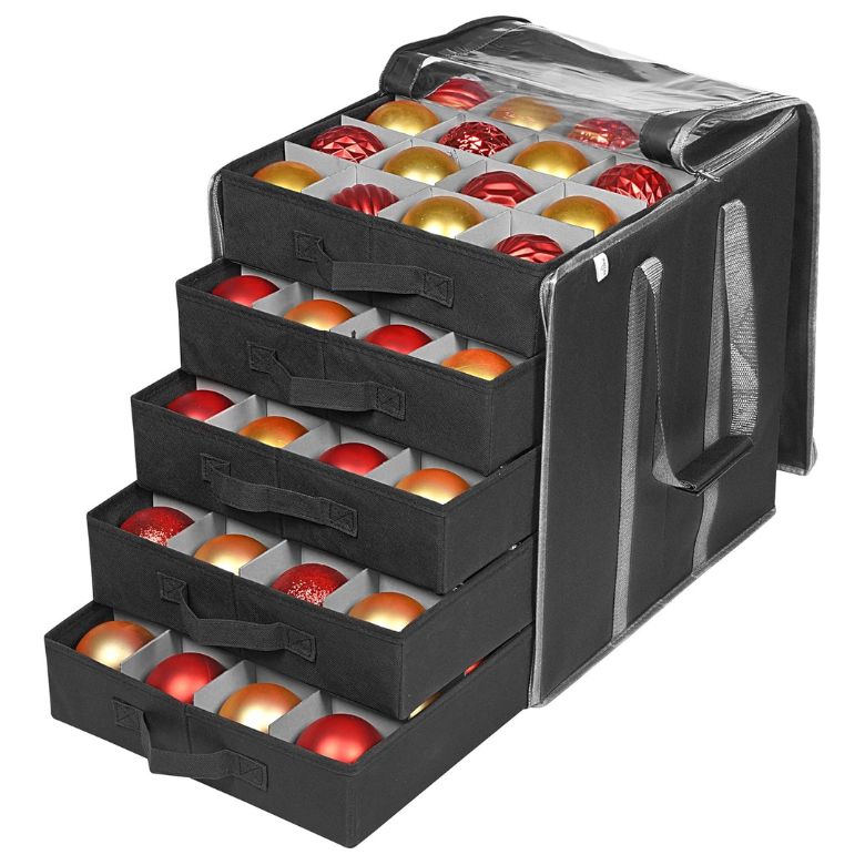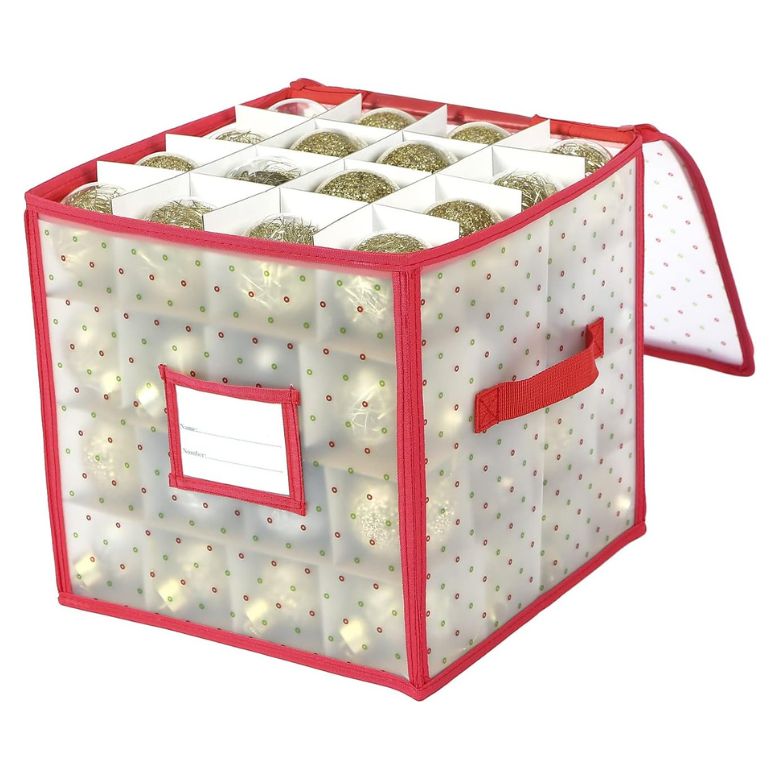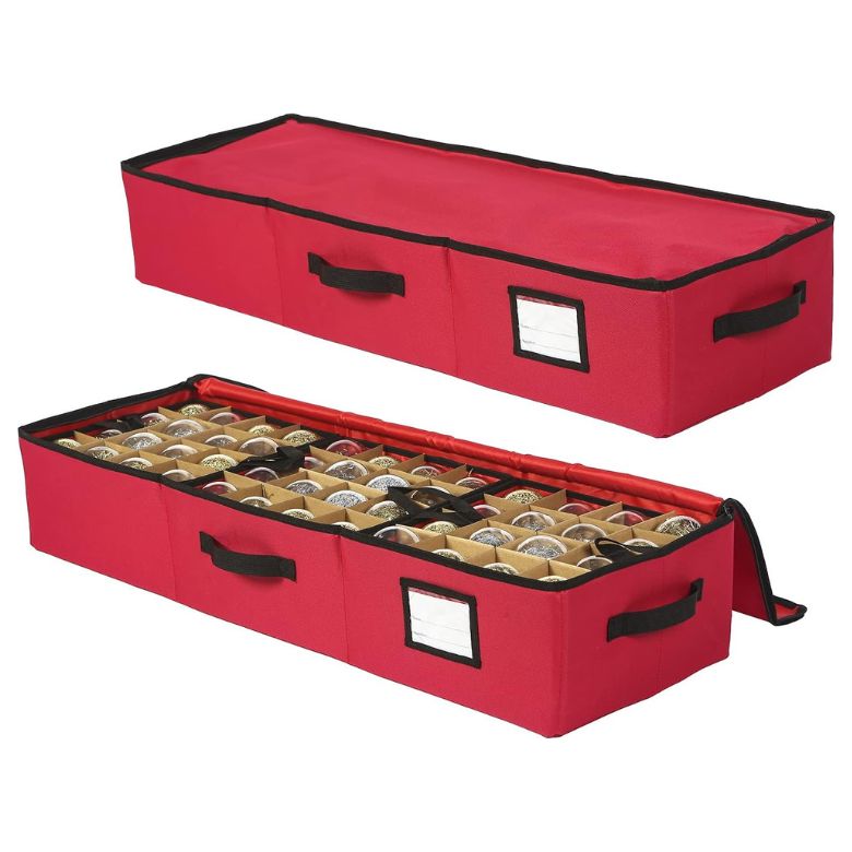 This ornament storage box comes with sturdy cardboard dividers to safely store up to 64 ornaments. It’s crafted from durable plastic and reinforced cardboard to last for years, and it even has a clear label slot to help you find exactly what you need at a glance. Plus, the cube shape is compact and collapses flat for storage when not in use.