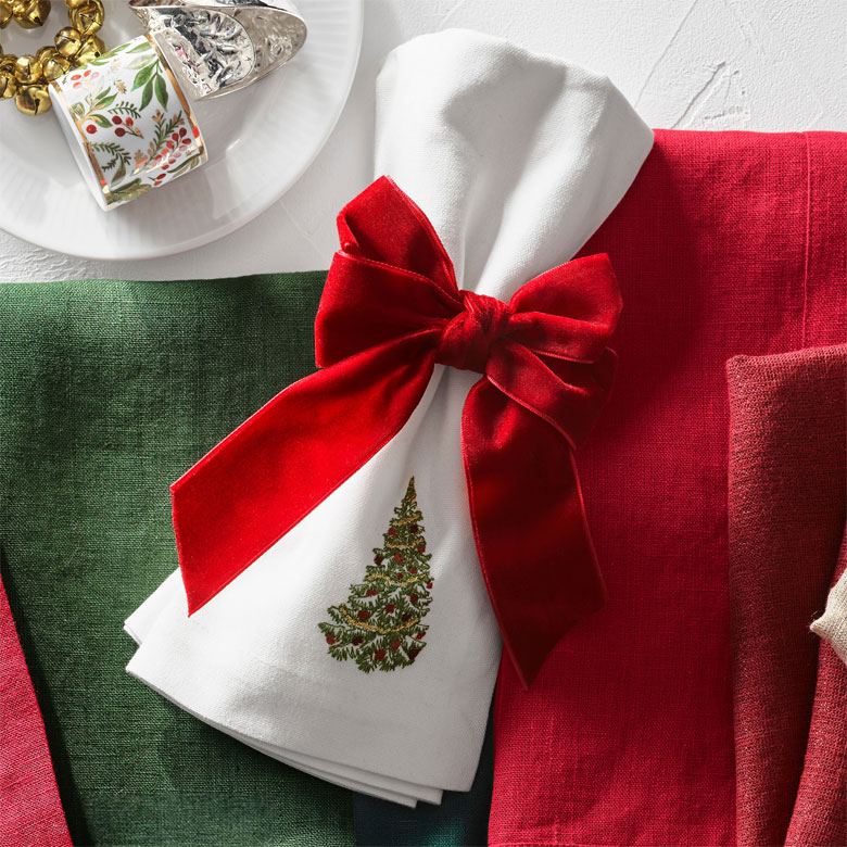 It can be as simple as a few taper candles or a holiday bouquet, but a centerpiece makes a nice focal point. You could layer small bells throughout the tablescape; use a table runner as the backdrop for a stunning collection of Christmas-themed items and decor; or make it a spectacle with a grand display of winter florals. Whatever you choose, be sure it pairs well with your other table decor like plates, napkins, and glassware. This is the perfect place to make a style statement, so have fun with it.