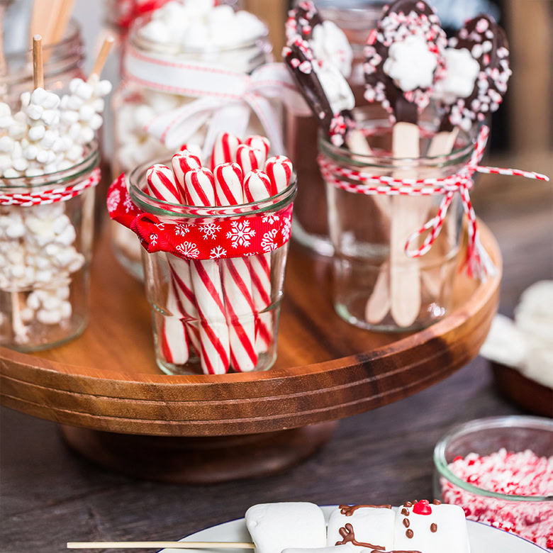 Who doesn’t love some hot chocolate during the holidays? Especially at seasonal gatherings, it’s thoughtful to think of fun ways to offer alcohol-free yummy drinks. “We always prepare a nice nonalcoholic beverage for our non-drinking guests,” says Karen Suen-Cooper. Make it fun with peppermint candies, chocolate spoons, and plenty of marshmallow toppings displayed in canisters for guests to mix themselves. We have a whole tutorial here to get you started and inspired.