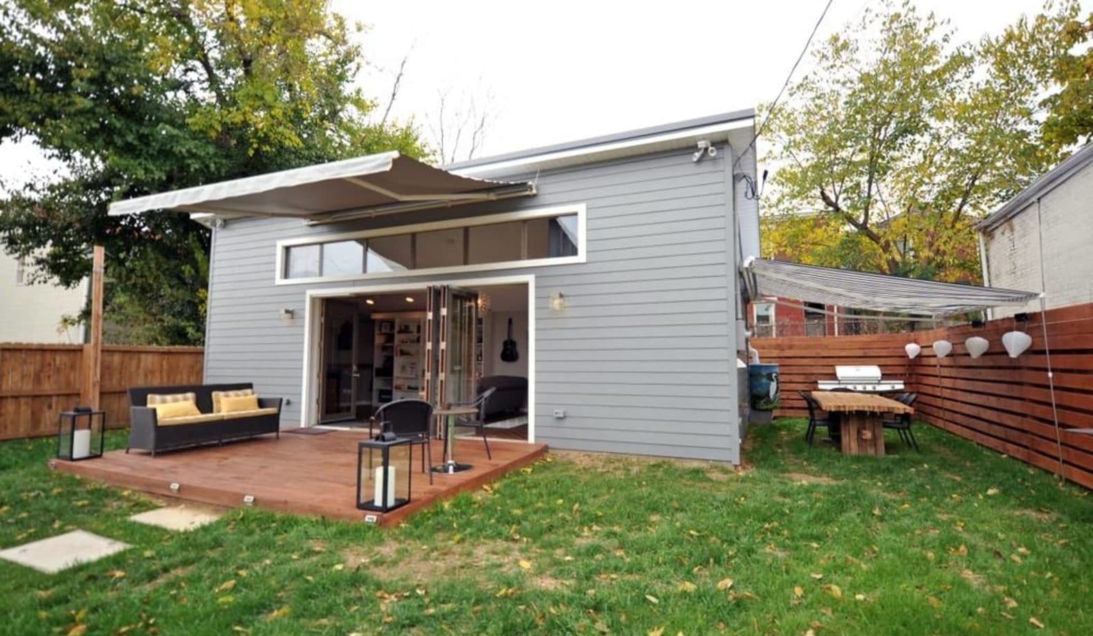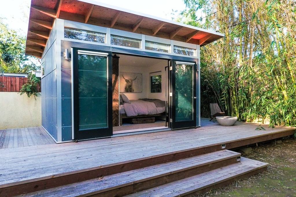 This charming rental has a studio layout, but folding doors and high ceilings make it seem larger than just 448 square feet. Also adding a spacious feel: a large yard, a patio space, and functional furniture—the bookshelf transforms into a Murphy bed.