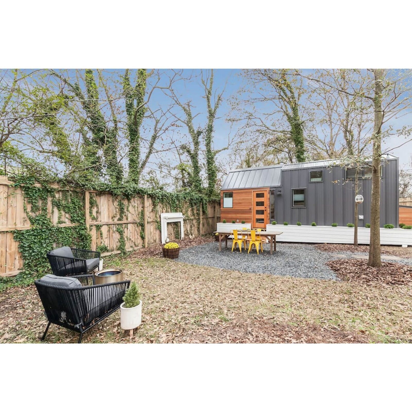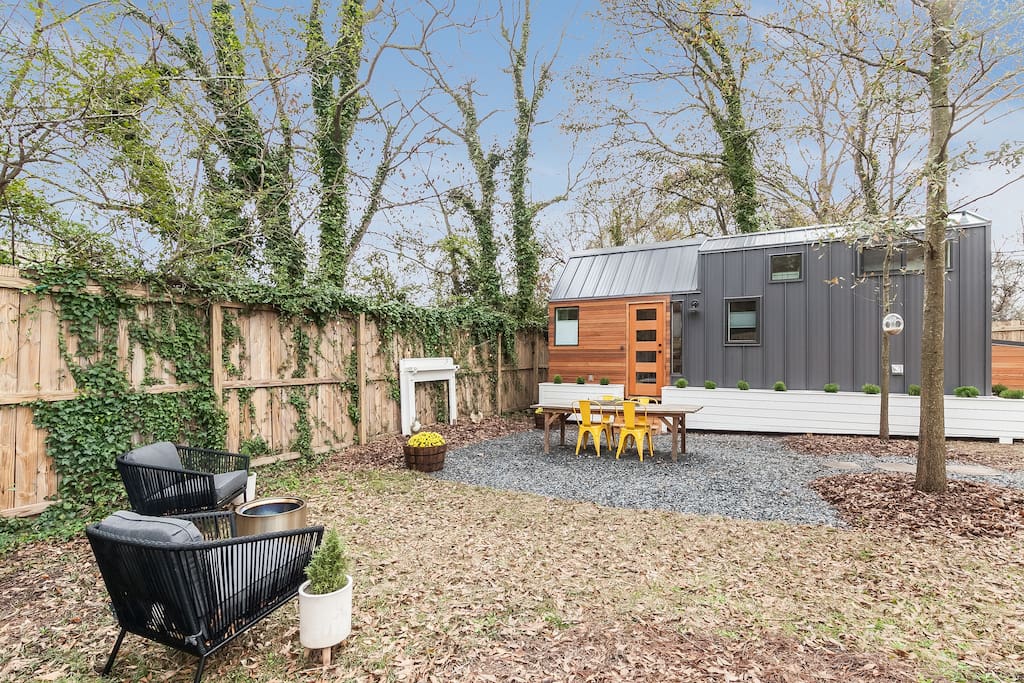 Even with a limited amount of space, each room in this tiny house in Atlanta has its own identity. There’s a full kitchen and bathroom, a washer and dryer, and two bedrooms with queen-size beds. In addition, the home boasts a private backyard with a fire pit.