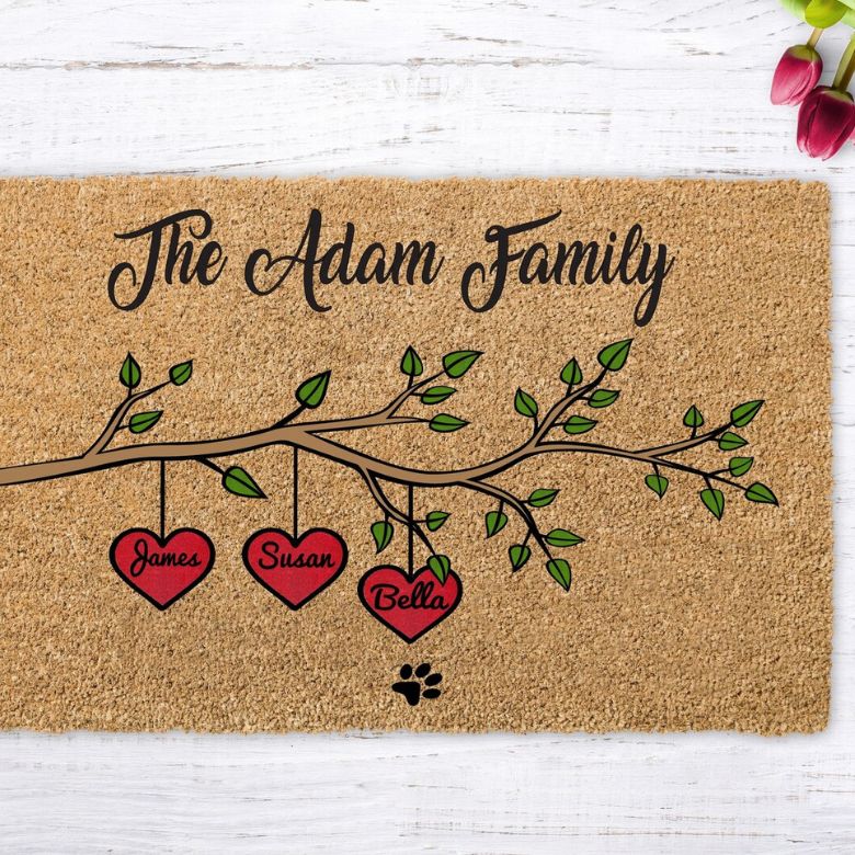 Nod to your family or the residents of your home with this sentimental family tree doormat from Etsy. This natural coir mat features a sprawling tree branch dotted with hanging heart ornaments. Each holds the name of someone near and dear to your heart (and home). You can fit up to six names on the design, and pets are denoted with a cute little paw print.