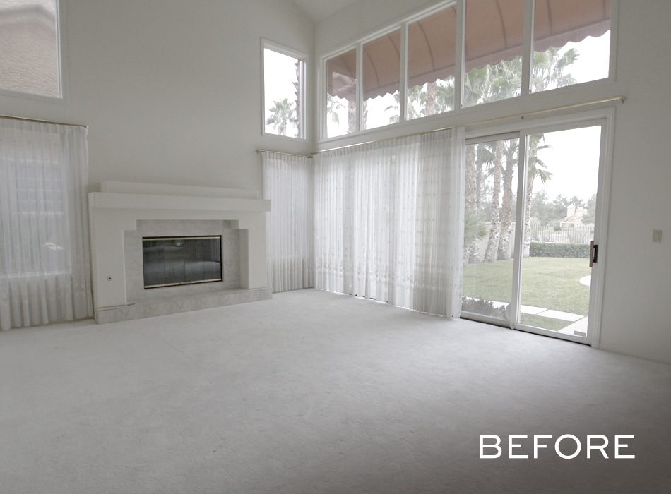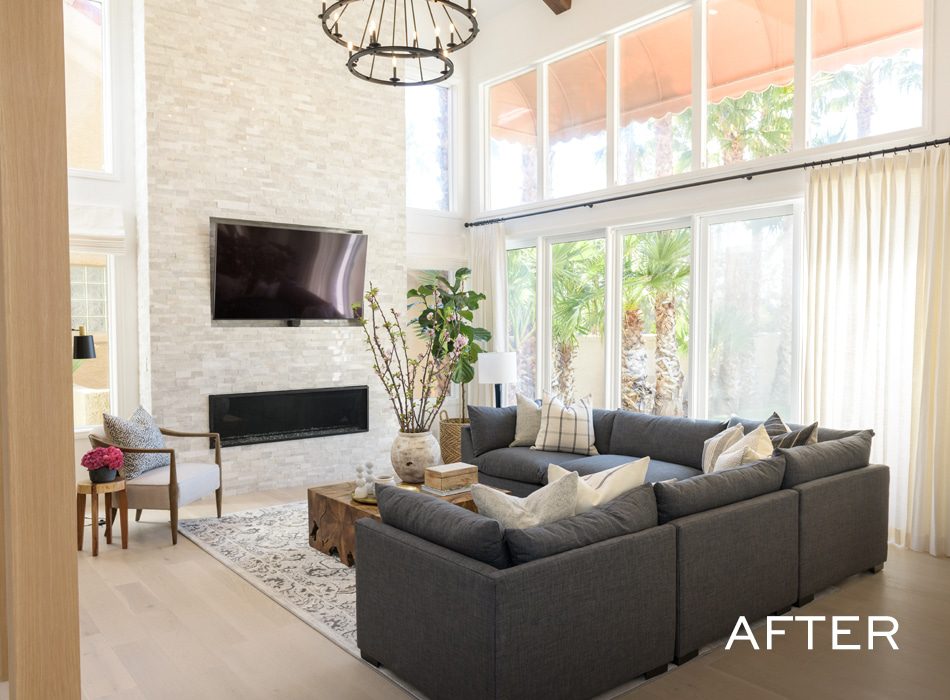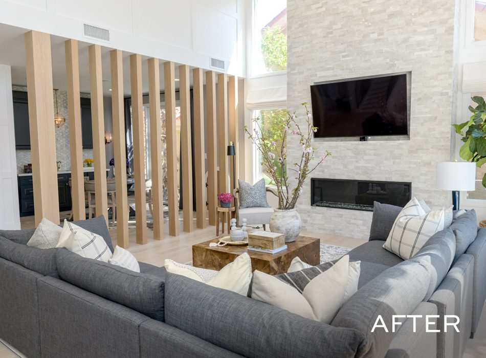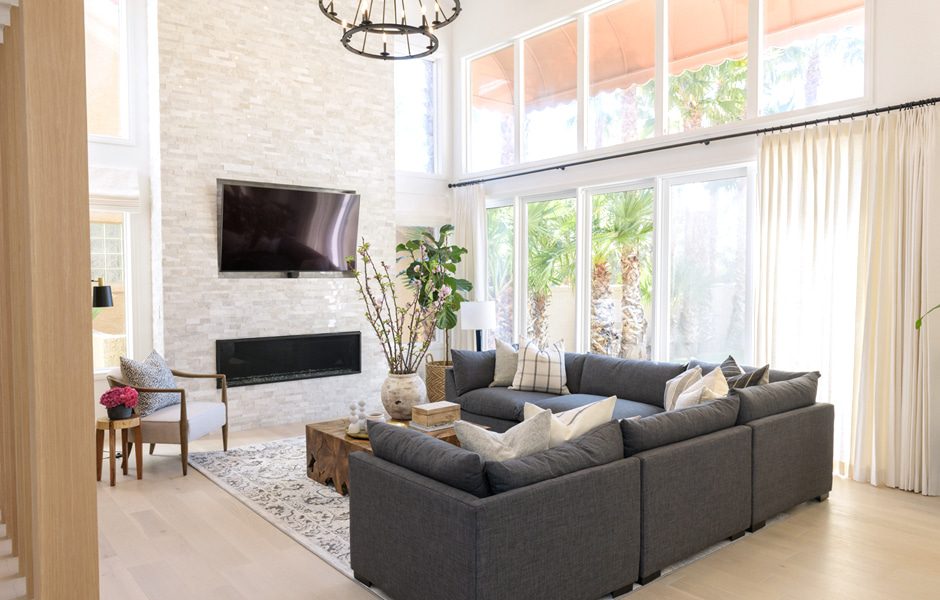 We demolished the existing fireplace to create this floor-to-ceiling, linear fireplace, which acts as the centerpiece of the living room and adds a feeling of grandness when you enter the home. We’d originally selected a dark tile for the feature, but after some last-minute back-and-forth with Lara, we landed on this beautiful, stacked-stone marble that not only creates texture and visual interest, but perfectly catches the sunlight from the room’s many windows.