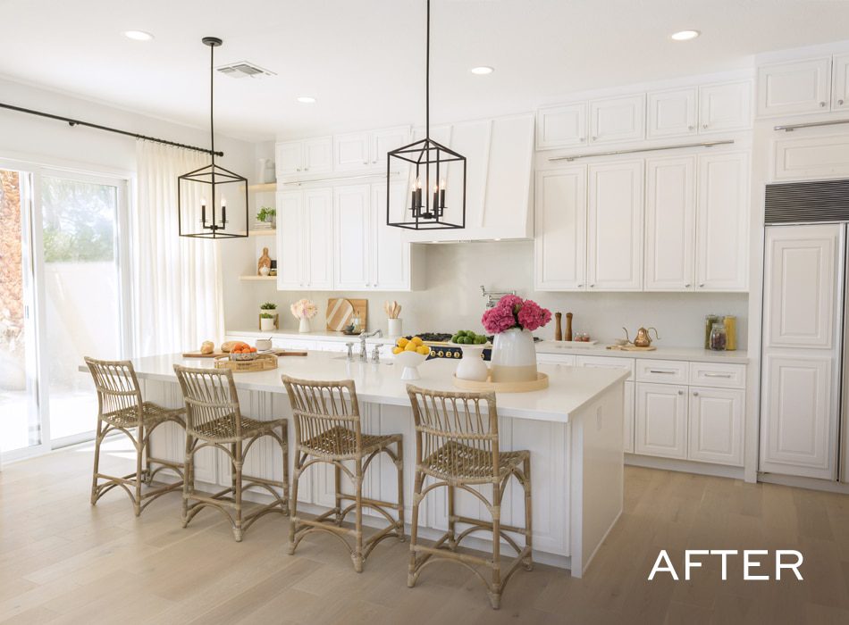 Adam moved in with his fiancé, Lara, and her three rescue dogs shortly after they got engaged. It didn’t take long to realize that things were a bit too tight for anyone’s liking—including the large pups. The couple enlisted us to help them find a home that they could move into before the wedding, which they were also planning at the same time. While that’s a lot to handle at once, we know how nice it is to come back to a finished home once the wedding’s over (from Drew and Linda’s experience!). The pair wanted to stay in the same community where they’d been living as it’s where Lara grew up, and she still has lots of family in the area. They also wanted to be near a golf course—they met at their country club and both enjoy getting out on the links. We eventually found them a home just a block away from their old address that we were able to transform into the open-concept, modern home of their dreams. And bonus: it came with a large backyard that backs right onto the fairway, and has plenty of grass for their four-legged friends.