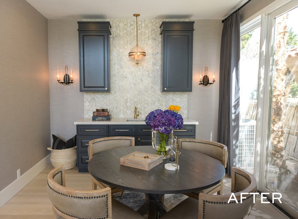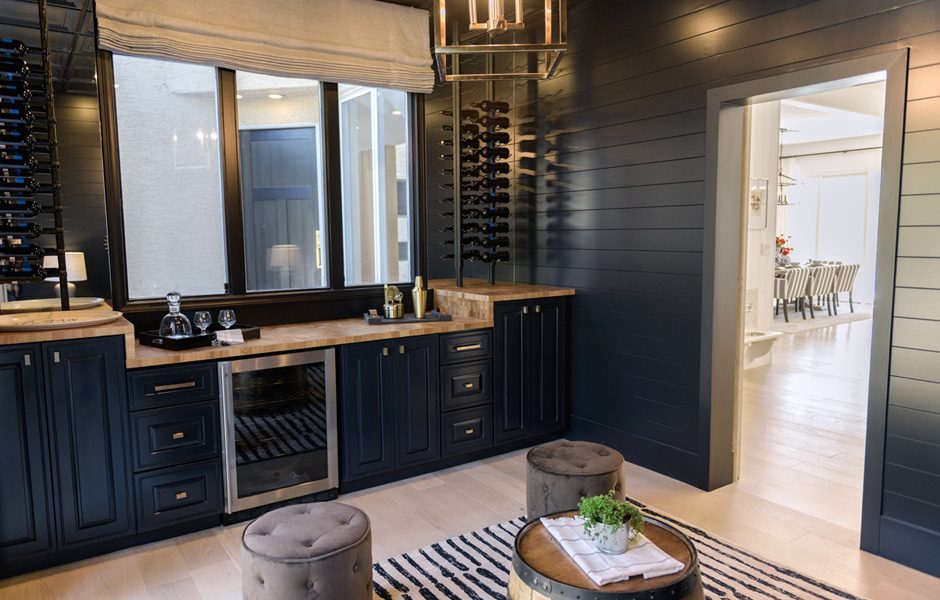 How many people get to invite friends over by saying “Why don’t you come by for a few cocktails at the speakeasy?” Well, now Adam and Lara can! This room is hidden off the back of the kitchen by a sliding barn door, and also features a separate entrance into the expansive backyard for truly covert comings-and-goings. Dark paint and and a custom whiskey barrel coffee table gives the room a touch of drama and mysteriousness that contrasts brilliantly with the rest of the home. It’s the perfect place for Adam to host his golf buddies after a few rounds at the course behind the home.