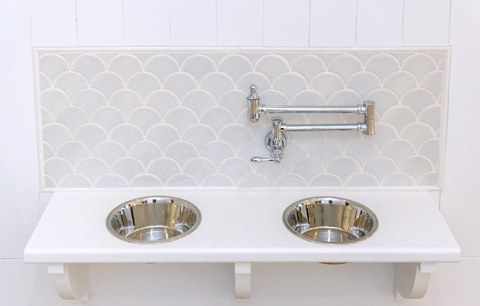 Adam didn’t consider himself much of a dog guy until he met Lara, who’s a long-time fosterer and has three rescues of her own (including one foster-fail). Adam wanted to surprise his fiancé and their fur-babies with something special, so we worked with him to build a custom canine station. There’s plenty of storage for their pet food, treats, and gear, but the finishing touch is this food and water bowl area, which we’ve accessorized with a pot-filler—oops, make that pup-filler—faucet and a custom backsplash.