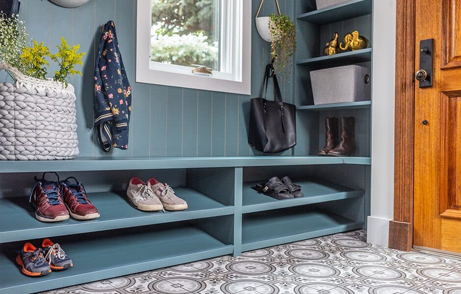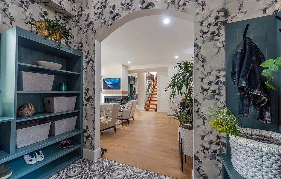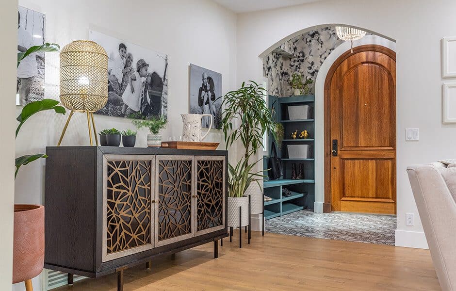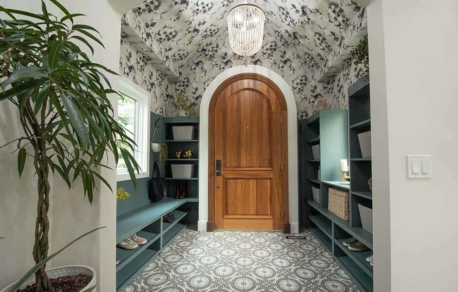 With the light, floral-toned wallpaper, anyone who walks in can feel the “California cool,” vibes Chris has dreamed of for their home. Add in the built-in storage, and this family of five can have a more efficient use of their limited space.