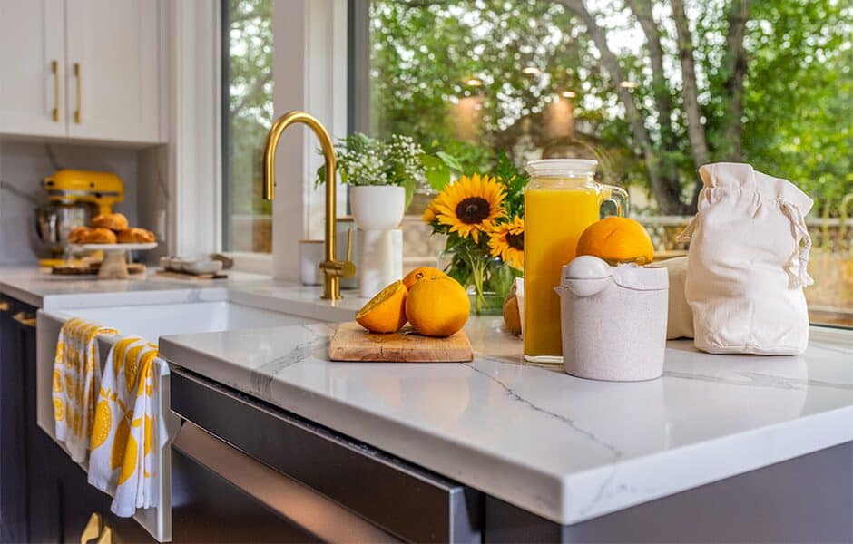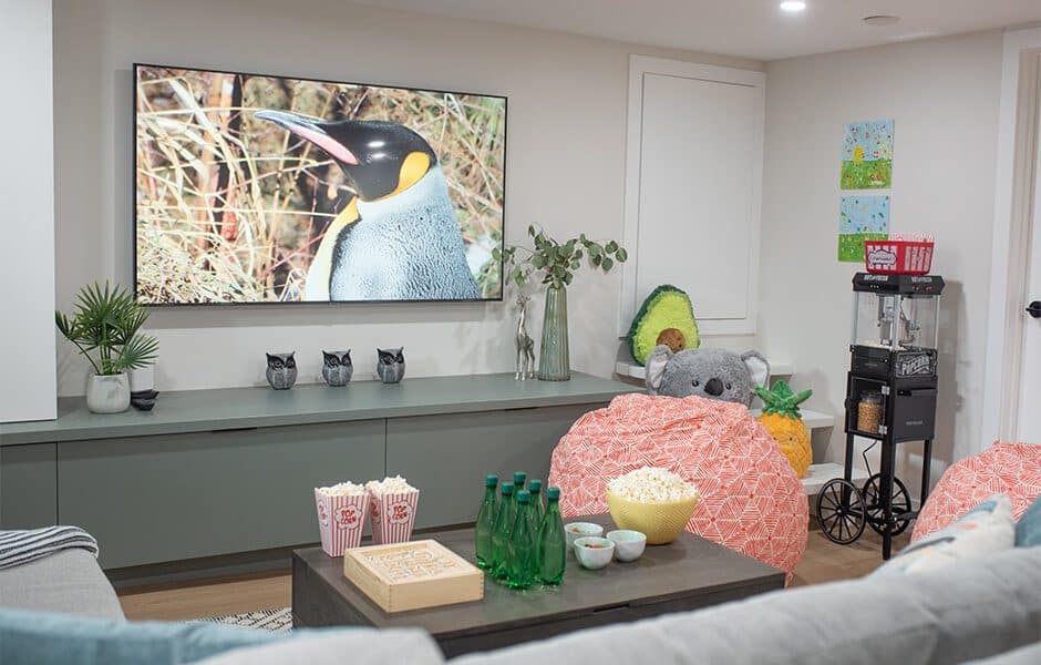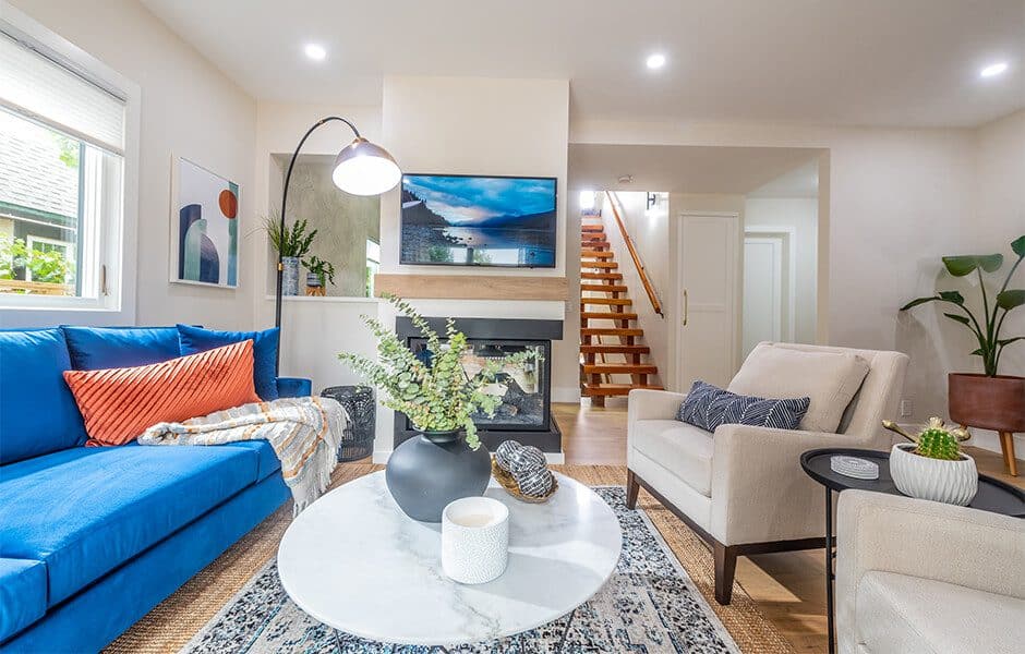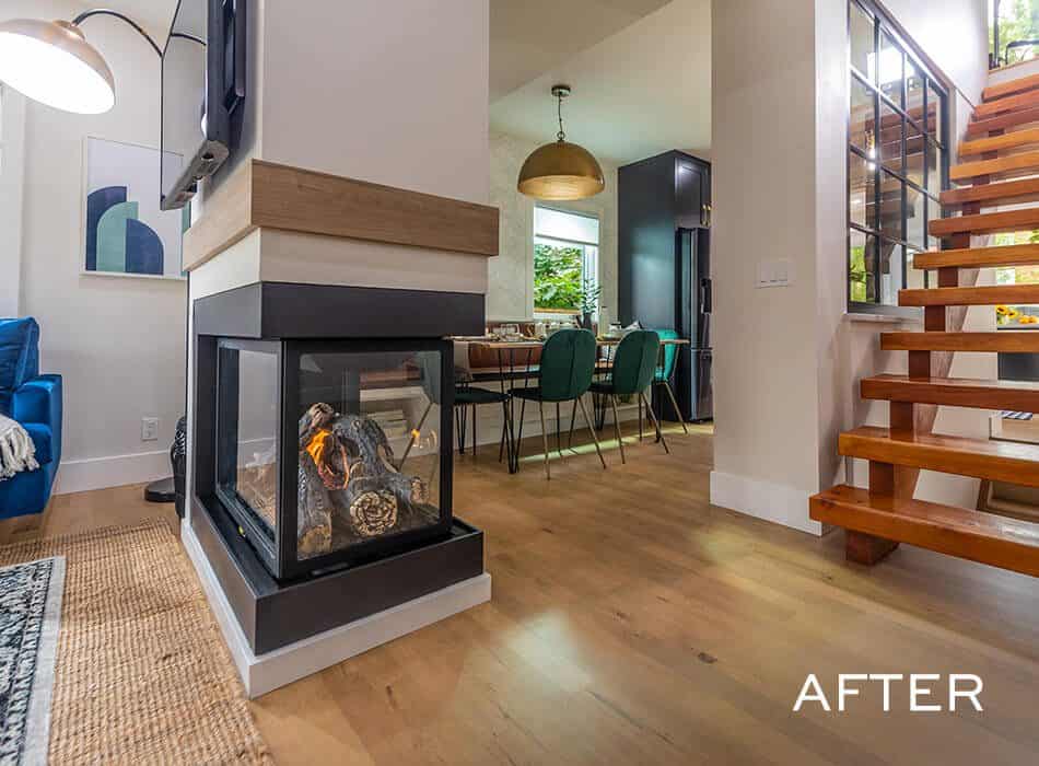 At the top of the couple’s wish list was the chance to elevate their living room from a holding area for hockey nets and floor saunas into a proper adult space. Fitted with a custom natural wood mantle, their three-sided fireplace acts as a stunning, focal point that marries the outside with the inside.