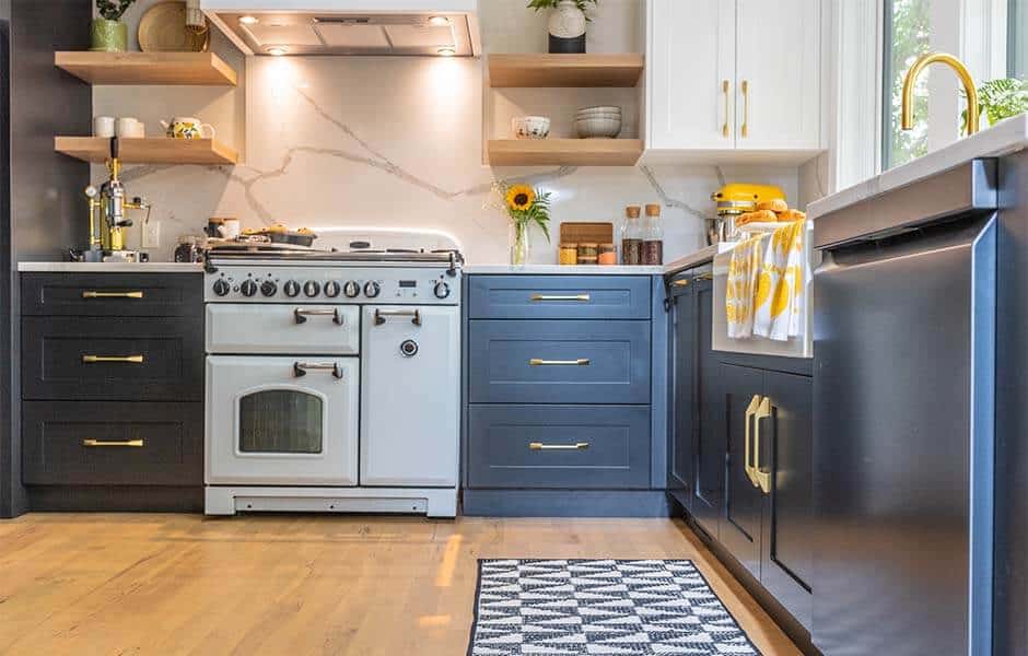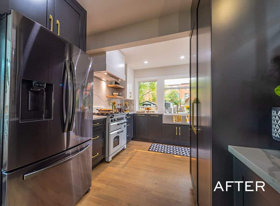 The kitchen was a very sentimental place for Aliya, so we wanted to give her as much storage as possible without sacrificing the natural light she loved so much. So, we split the difference and added a floor-to-ceiling pantry. The rest of the kitchen was painted black and white to create a bold and high-contrast look.