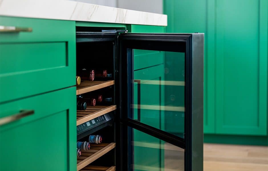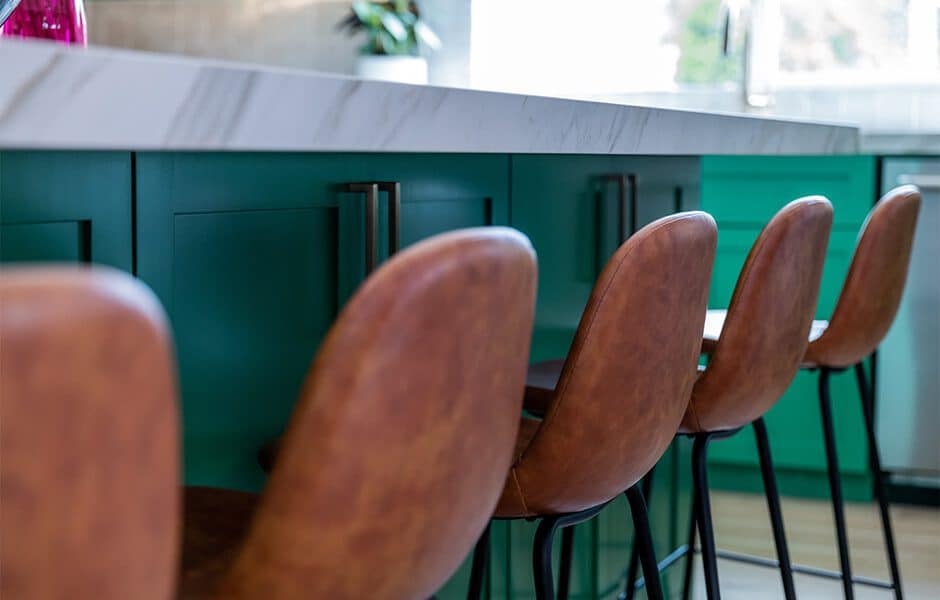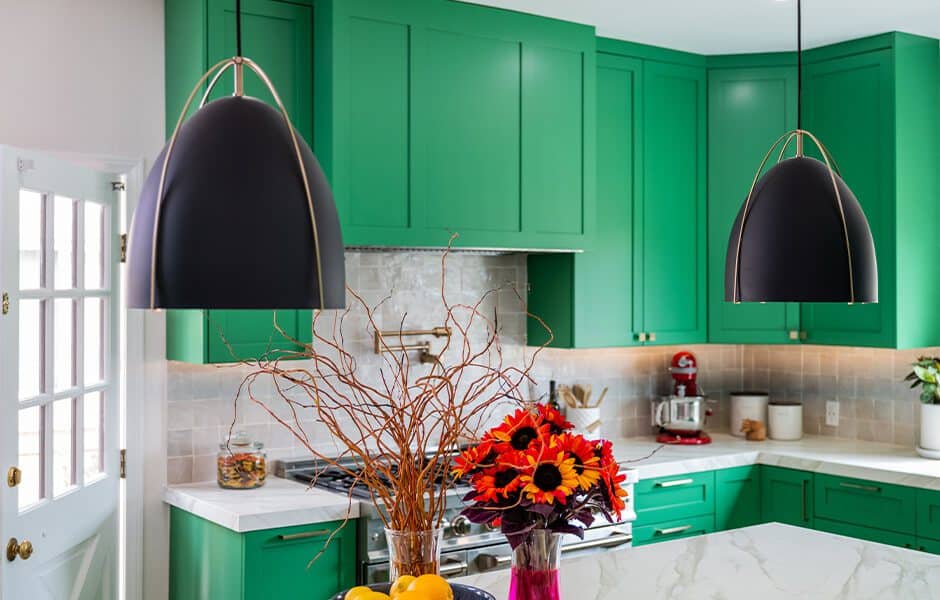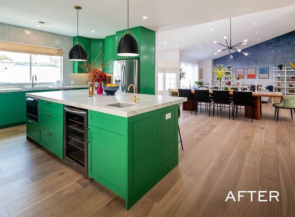 So, let’s talk about those cabinets: Allie and Ben were big into the rich, deep green in the inspiration home’s living room, but that home’s kitchen cabinets were a more muted, sea green. So, they wanted a colorful kitchen, but were willing to go bolder … so why not both? We went with the bolder green that stood out to them, combined with gold hardware they liked and a handmade, artisan tile backsplash to provide the classic element they wanted.