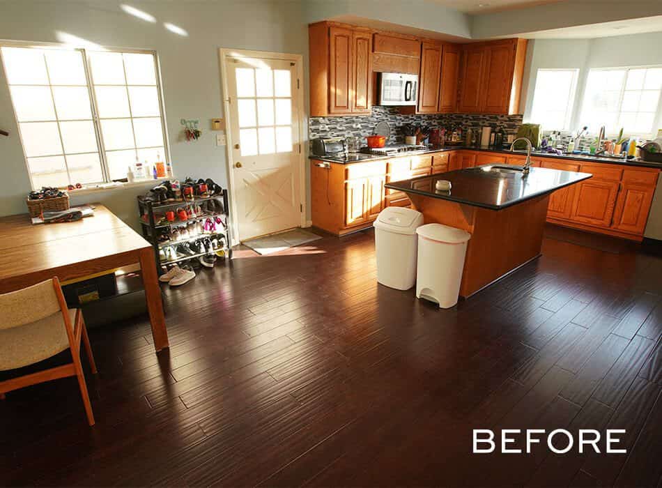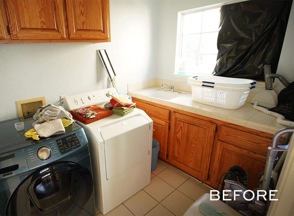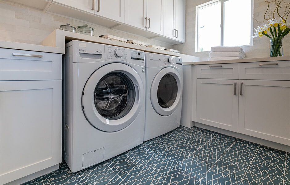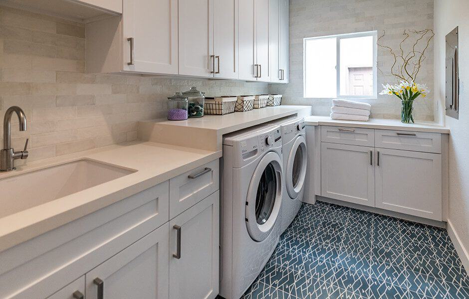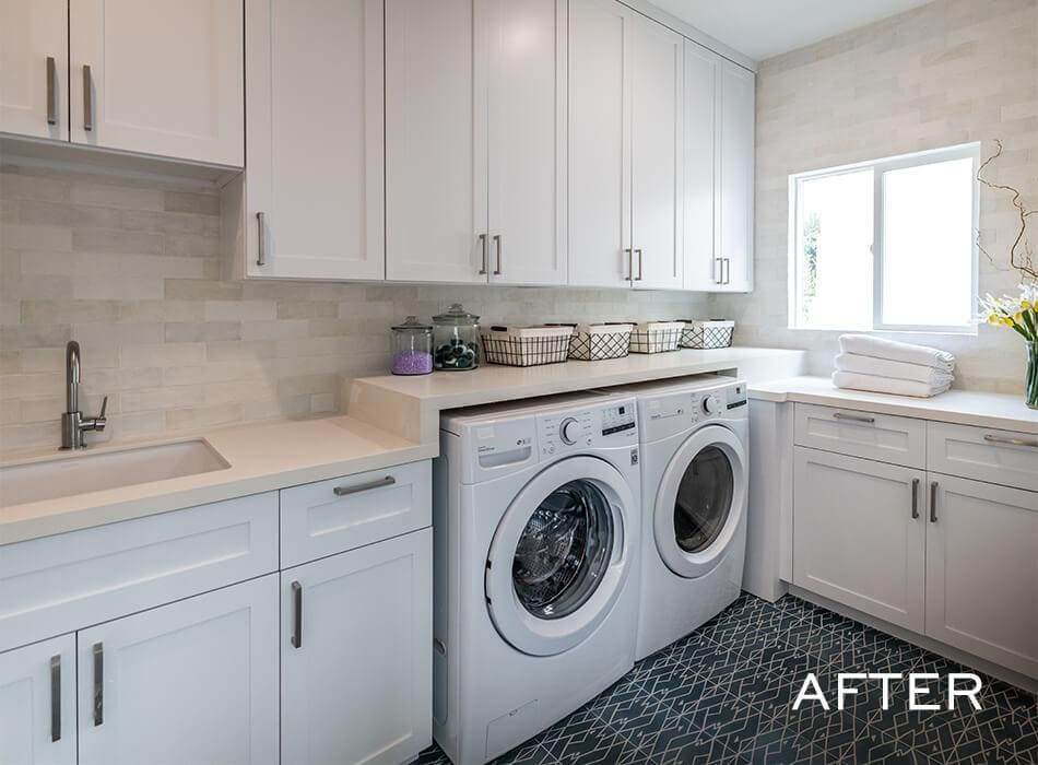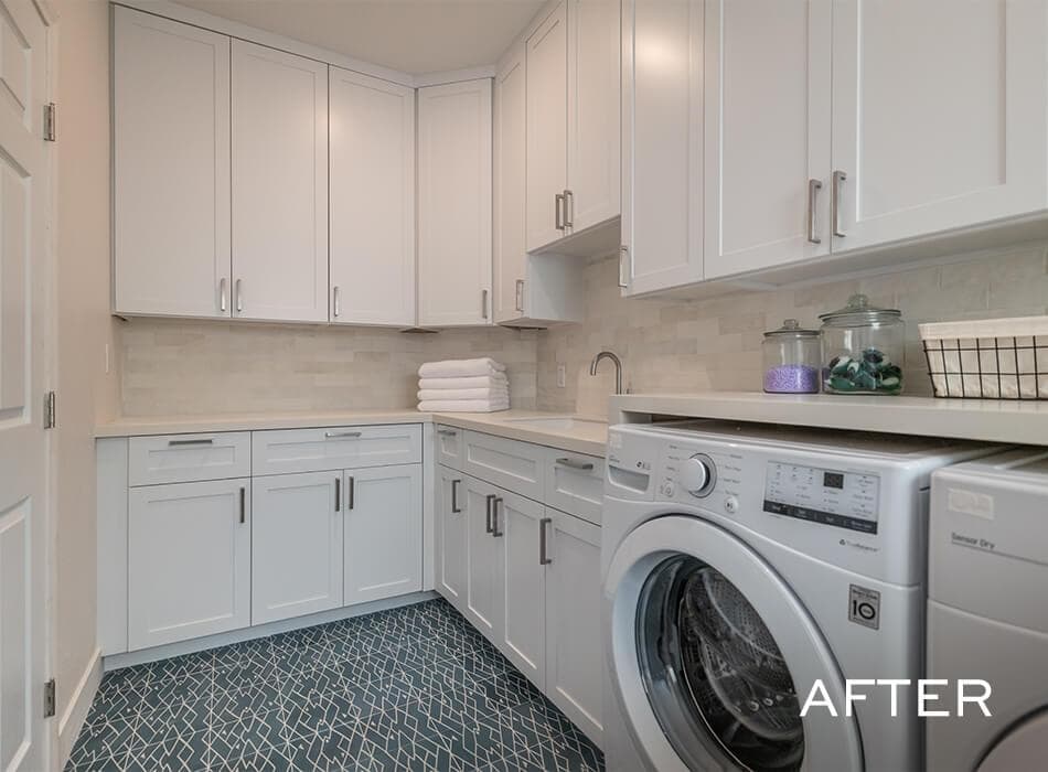 The previous laundry room was cramped and in need of repairs, so we broke through the wall to the underused pantry and gave the whole space a top-to-bottom remodel, including a new sink and dedicated space for the washer and dryer. We brought color into the room through new floor tile, which you always want to put down in an area like a laundry room that’s exposed a lot to water. Plus, it just looks cool!