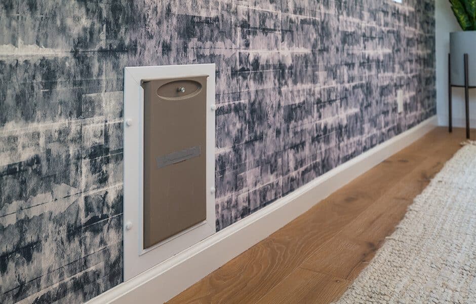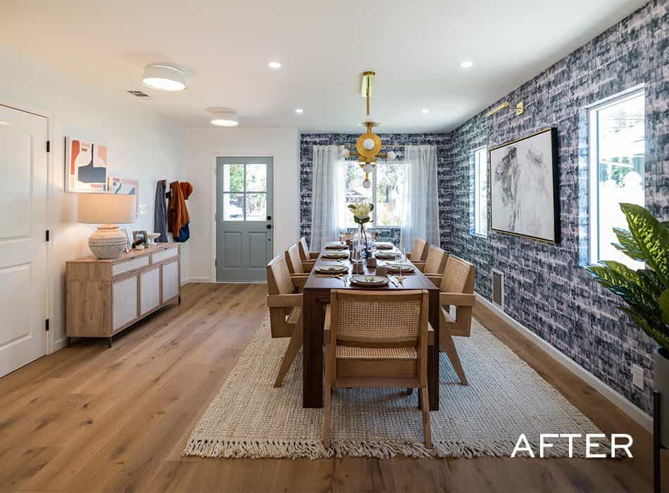 With how bright and light everything was in the kitchen and living area, we knew we could get away with a little darker wallpaperin the dining room. It helped that Amber and Alex were willing to create moments of color throughout the house, and we wanted a big moment here. This print helps their dining room feel defined and self-contained, while still incorporated into the rest of the open design.