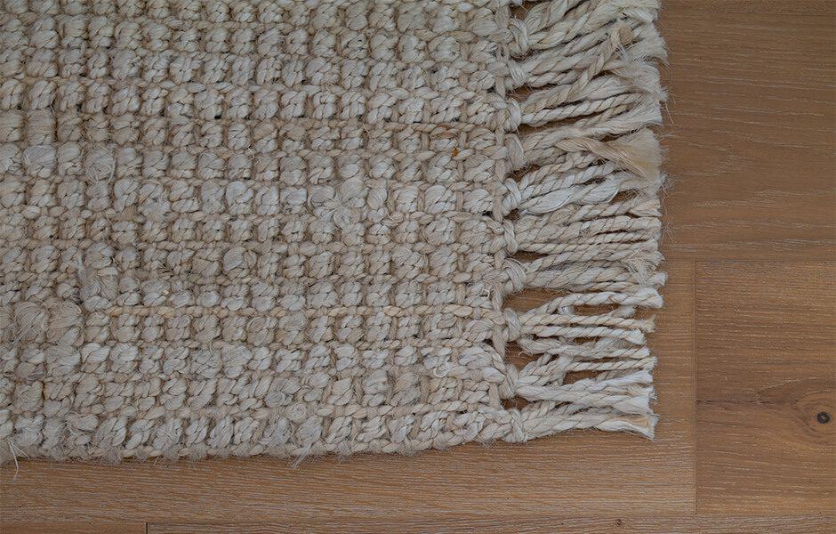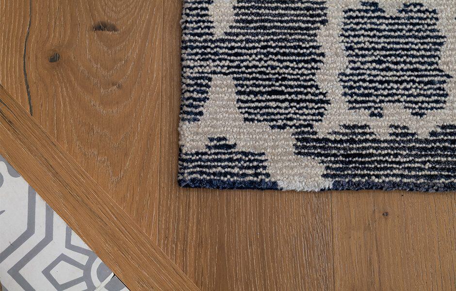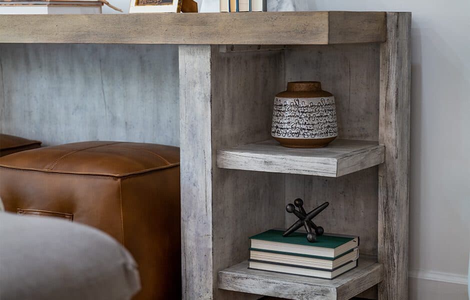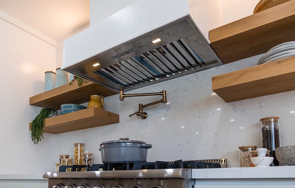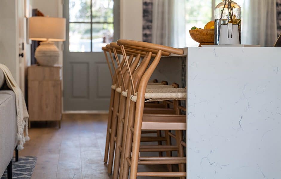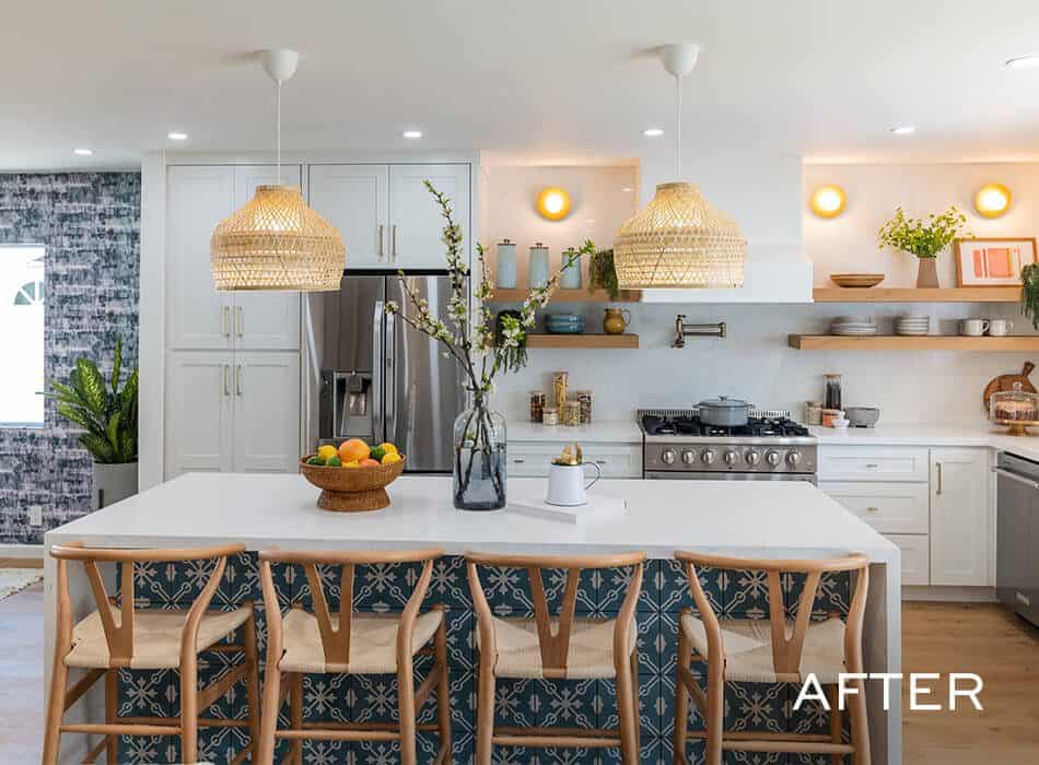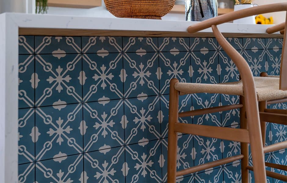 Not content to let the fireplace be the only place we introduced tile, we did it again on the back of the kitchen island—but this time, with a lot more color, so it stood out against the white and natural tones of the rest of the kitchen. The waterfall counter obscures it just enough as you come in from the dining room, giving a little extra surprise to guests who are walking through this beautiful space for the first time.