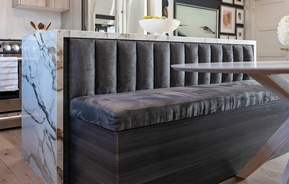 The family’s kitchen was extremely dated, not to mentioned damaged, with a broken windowpane from an errant toss. We completely overhauled the entire layout, adding in this combination island/banquette that features a table perfect for a lovely dinner, or a lively game night.