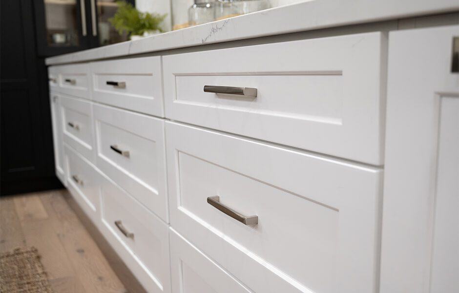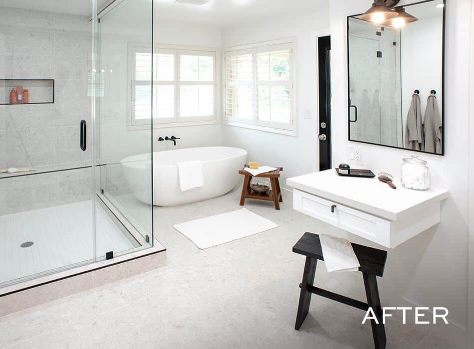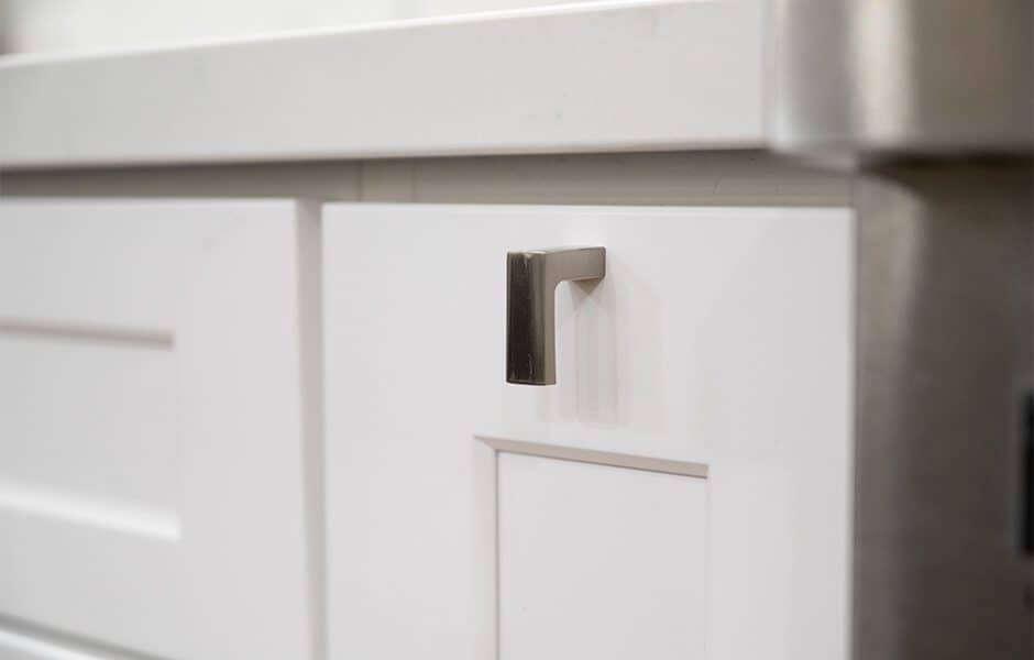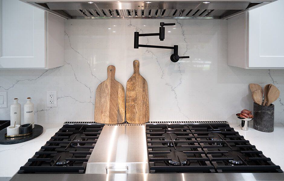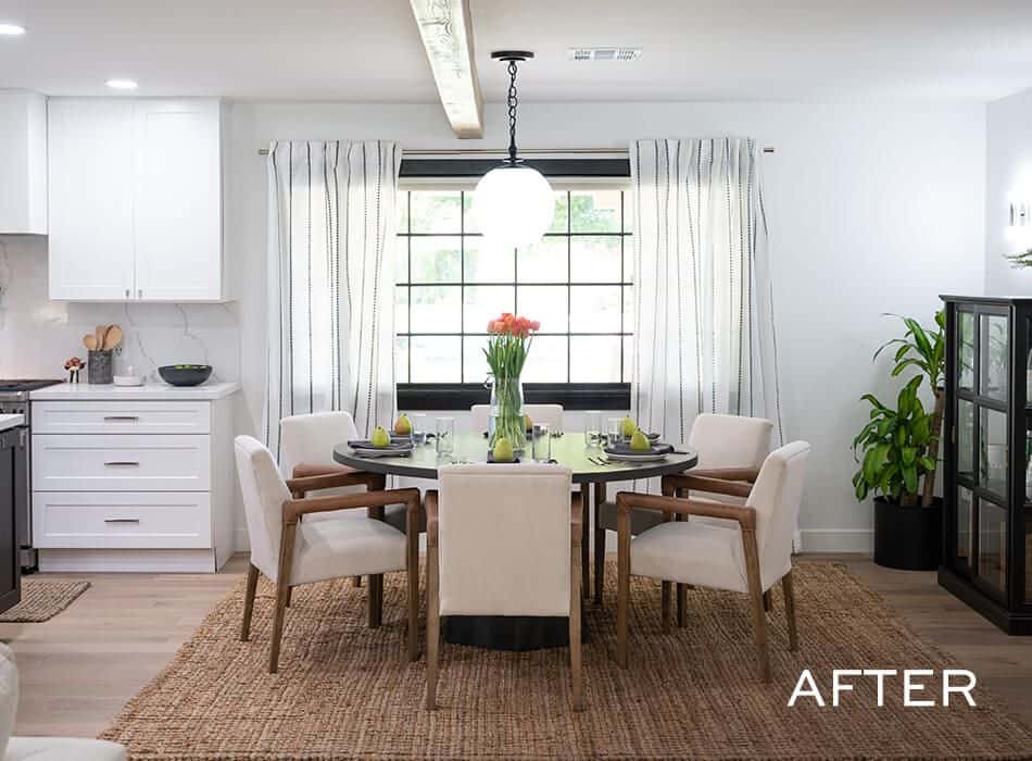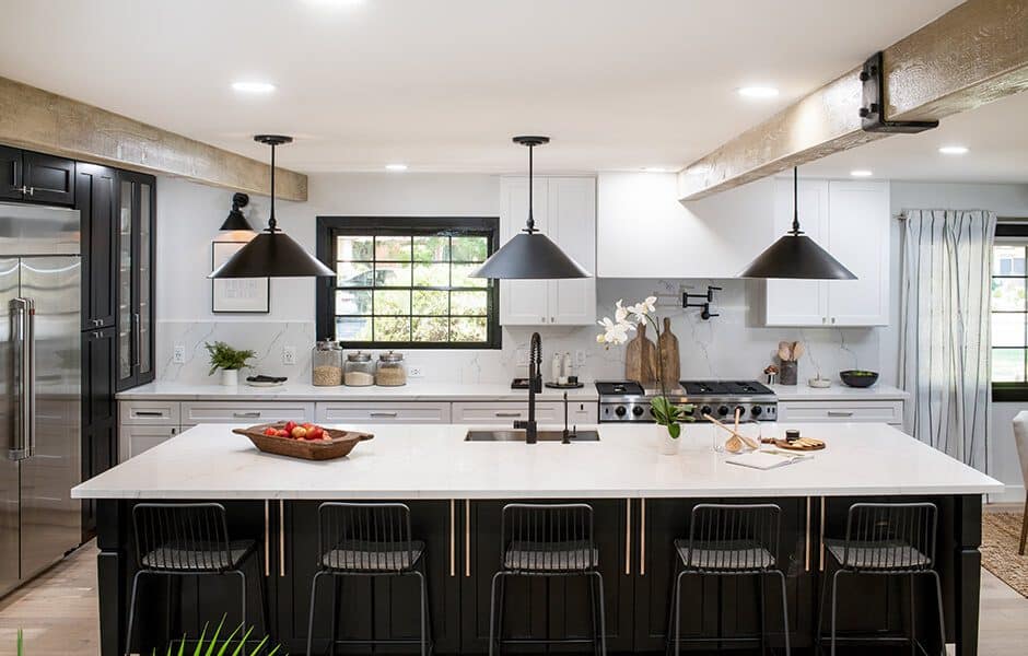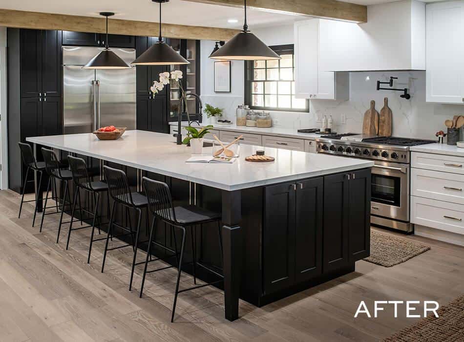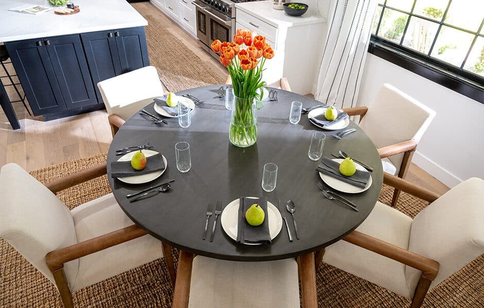 Ashley wanted a circular table in the dining room so they could use it both for meals and for hosting game nights, but we knew they’d need more seating, so we added an extra-large island with five more seats and ample storage. We kept much of the original kitchen layout, but moved the refrigerator where the wall oven was and installed an impressive gas range so they could feed all their guests.