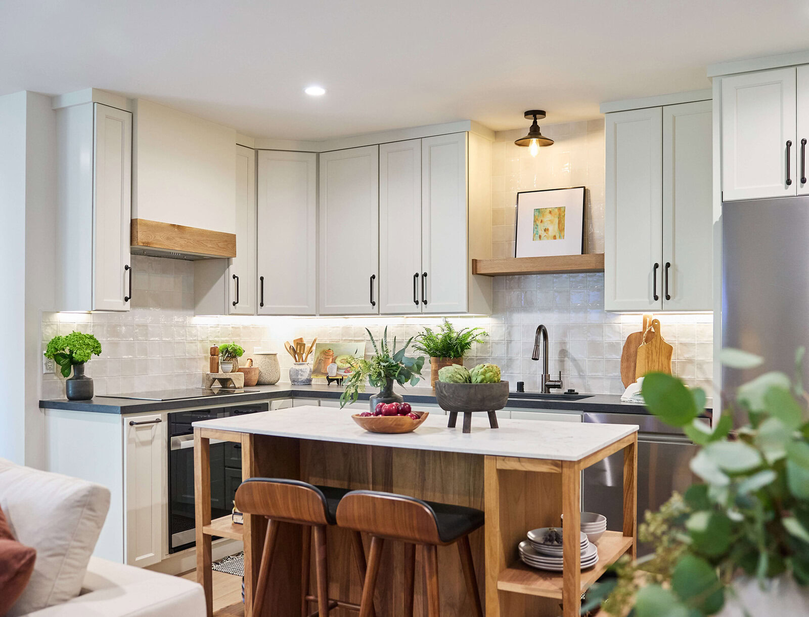 As they shifted their plans inside to accommodate certain spaces moving around, they decided to turn the kitchen into a sleek open layout. It’s complete with a cozy breakfast bar and design-forward style choices that prioritized organization and modern finishes.