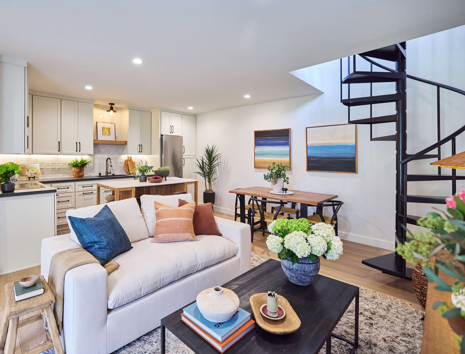 The spiral staircase was a big topic of conversation during renovations, and very polarizing among the investors and Drew and Jonathan! In the end, the staircase was a stylish choice that adds value in its design and function. The space feels cozy and open, especially with the construction choices they made along the way to open up the interior.