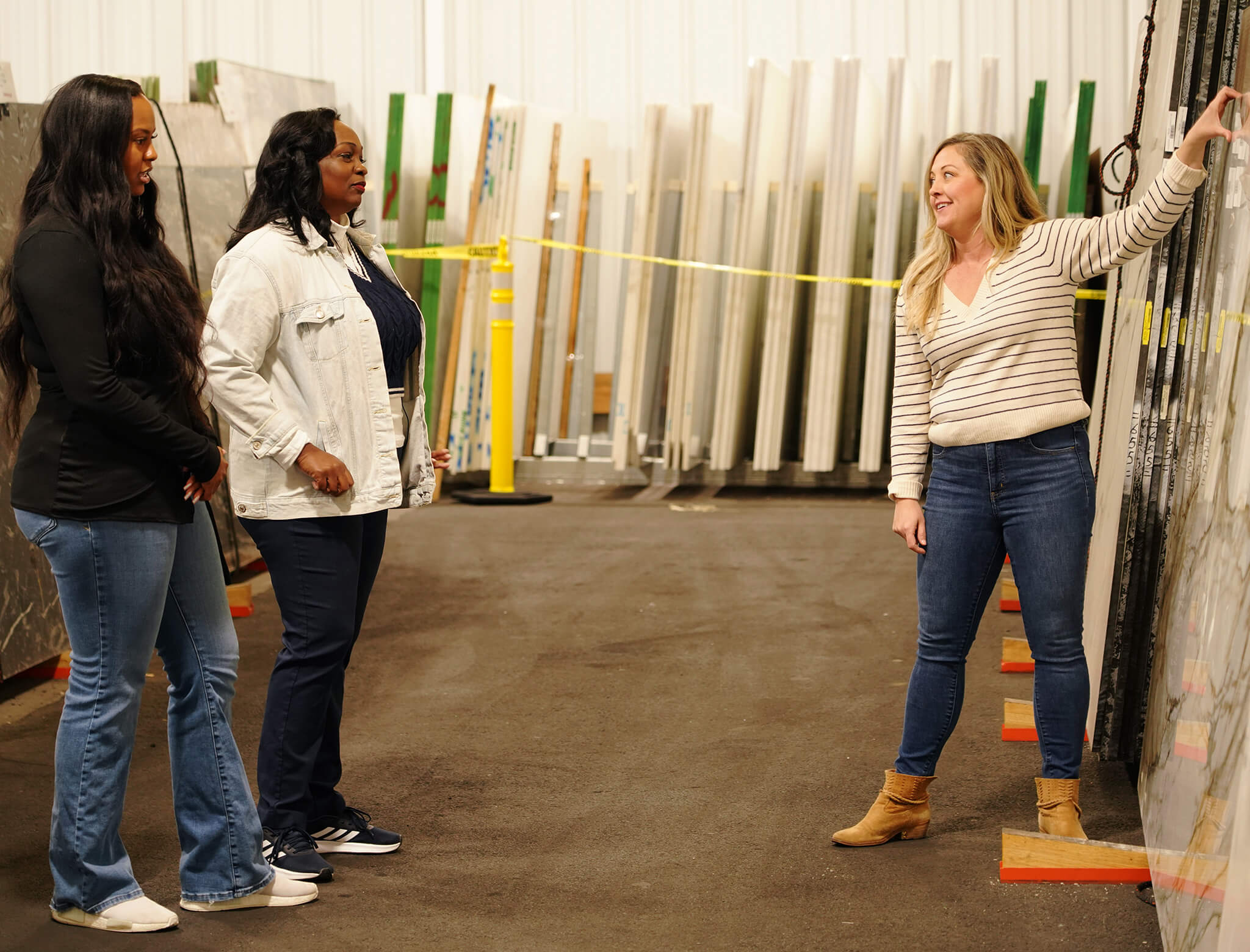 Kelly showed the duo that they can still incorporate the gorgeous stone they want. But by going to the back warehouse to check out discounted slabs of porcelain, rather than natural stone, they’re saving huge in the end.