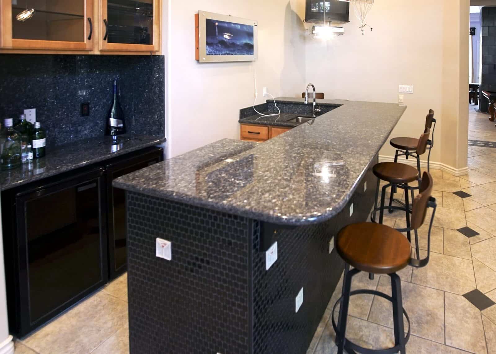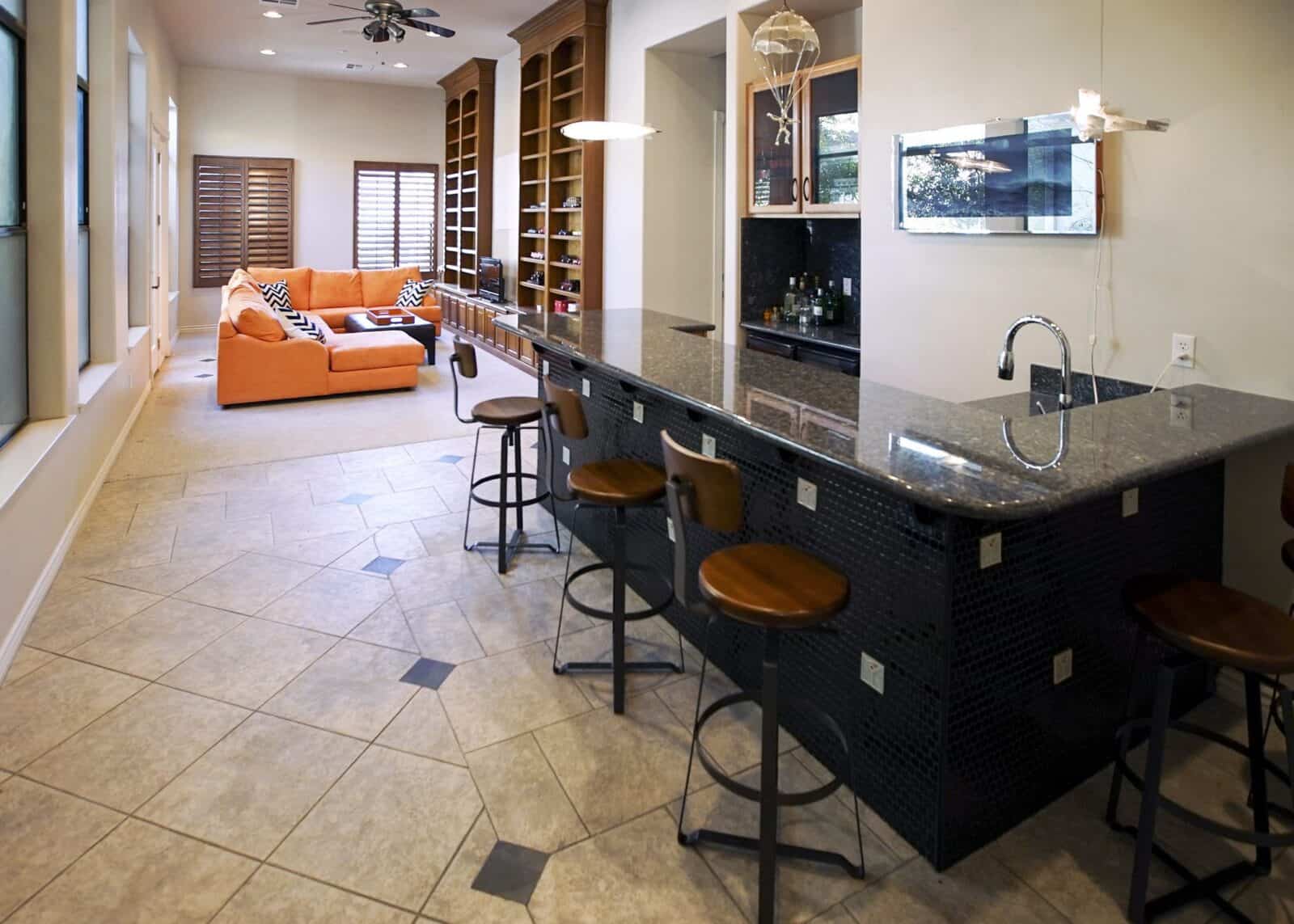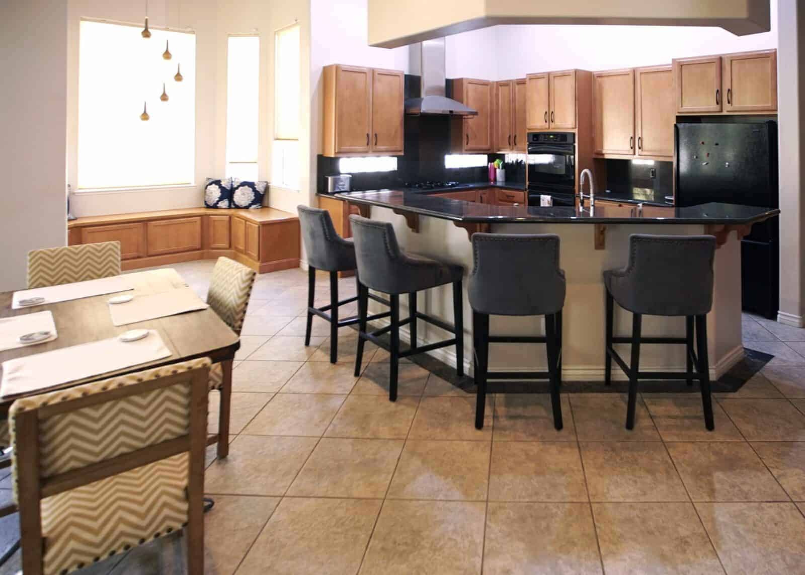 Brian and Meghan’s sprawling Las Vegas property is a good example of a tough life lesson: Even the nicest homes can have design flaws. In this instance, there was a floating half wall suspended above the kitchen island and an incredibly awkward eat-in banquette—not to mention a few less-than-impressive builder-grade materials throughout. We opened up the heart of this home, then added fun and functional design details so the family could get the best possible use out of their kitchen, living room, and game room. The result, which includes a custom arcade game, was a winning renovation.