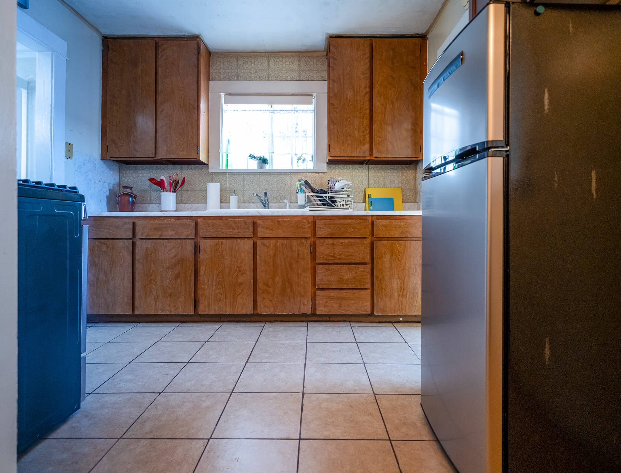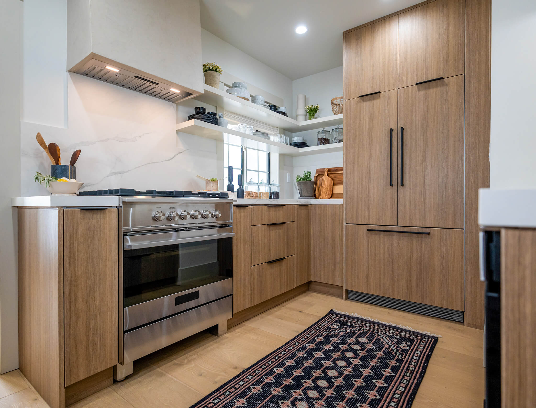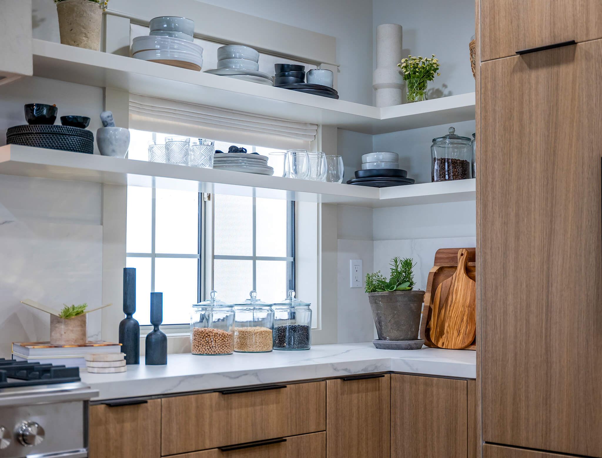 Lining the open shelving across the window is a creative, fun way to take advantage of the space and use it to its full potential. The creamy white range hood blends seamlessly into the wall, making for a more designer look.