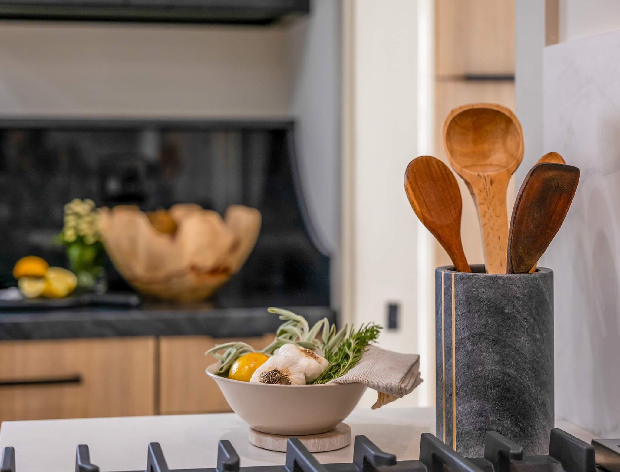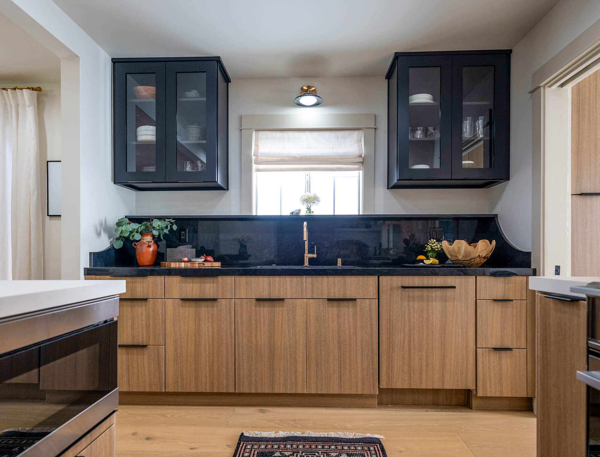 Moving into the kitchen, there are two zones. The contrasting light wood cabinets against the black countertops offer a sophisticated vibe. At first, Jonathan and Camryn were at odds with how this area should be designed. Camryn was hesitant about the striking contrast between the upper and lower cabinets.