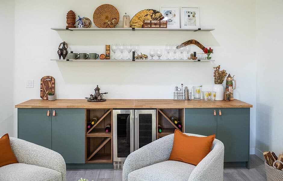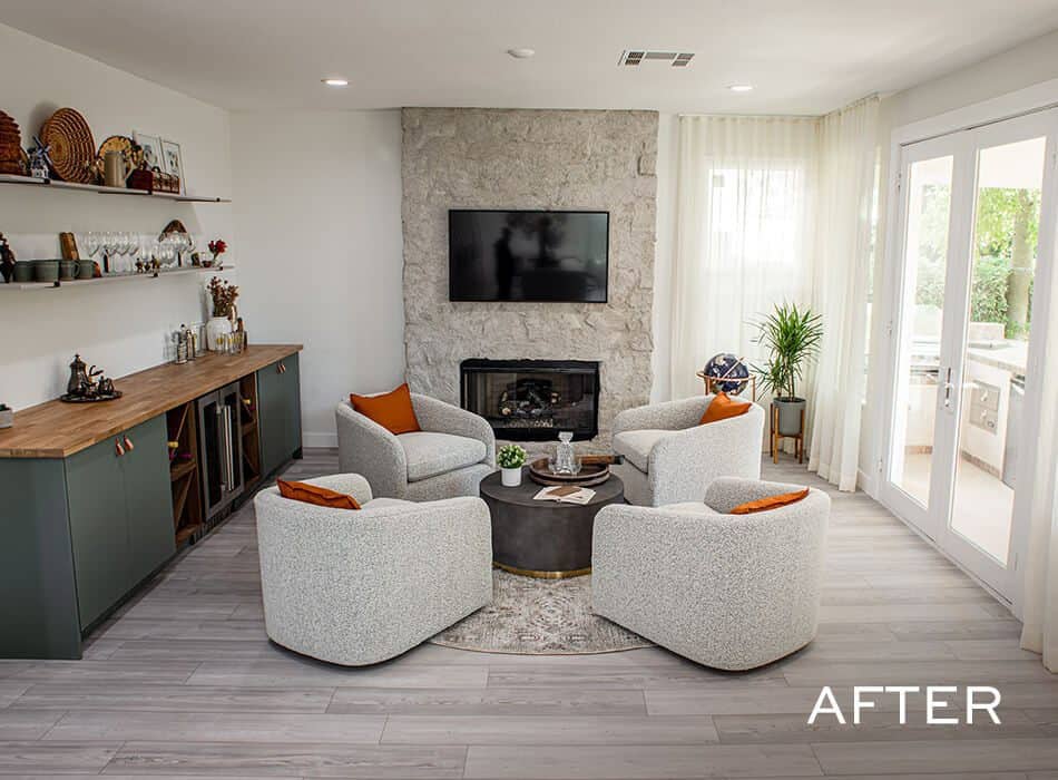 … new seating area, replete with refinished fireplace and a custom sideboard where Carlee and J.J. can easily pull a few of the bottles from the wine room we built for them under their stairs. This space was underutilized previously, so we wanted to give them a thoughtfully designed space that beckons people over for after-dinner drinks and conversation.