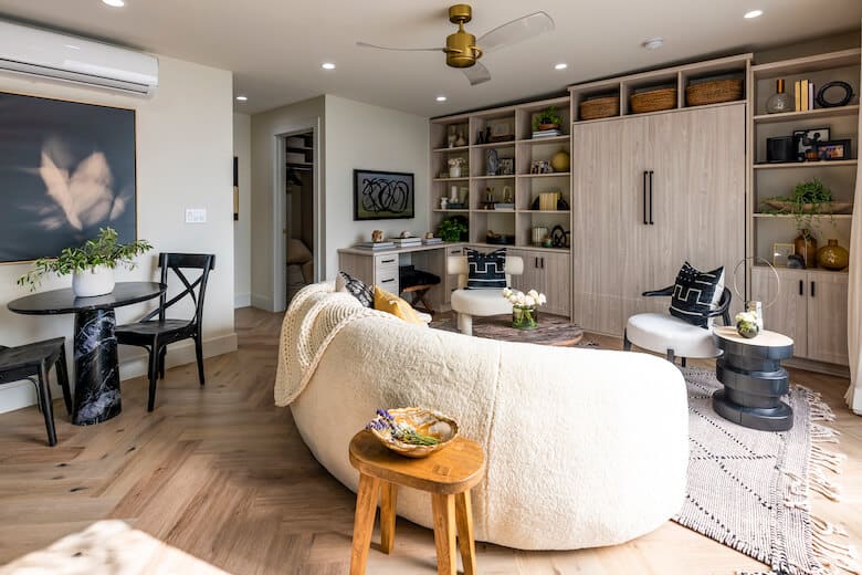 Since Sarita works from home, it was important to give her an area where she could work without getting distracted by her kids or other household chores. Plus, when her parents visit, she can pull down a Murphy bed and transform the space into a guest room.