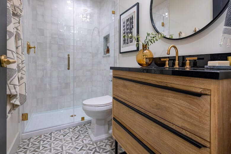 When it came to designing the bathroom, Cheryl knew exactly what Sarita would want wanted. From the patterned tile to the star-shaped light fixture, each feature adds a splash of drama to the room while remaining modern and functional.