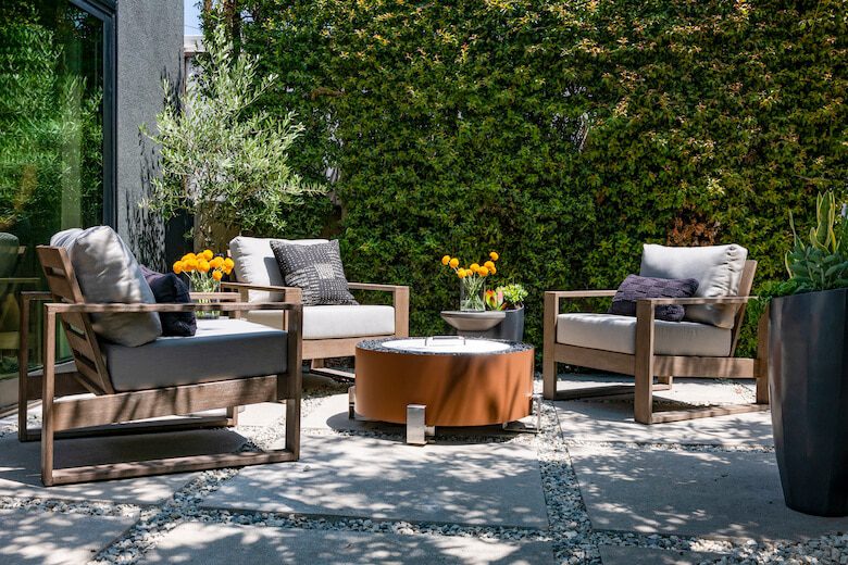 Sarita loves the outdoors, and because there wouldn’t be much need for a driveway without a garage anymore, we decided to set up a nice lounging space outside. With comfy seating, a warm firepit, and gorgeous landscaping, the entire family can gather around and roast s’mores whenever they want.