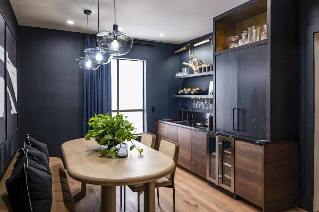 Visitors would hang out in the dining room previously, but it wasn’t an entertainer’s dream. We installed a super sleek bar with a fridge, so Mark can juice with his clients during the day and sip wine at night. We also honored his go-to mantra, “Best Day Ever,” with a cool, custom sign.