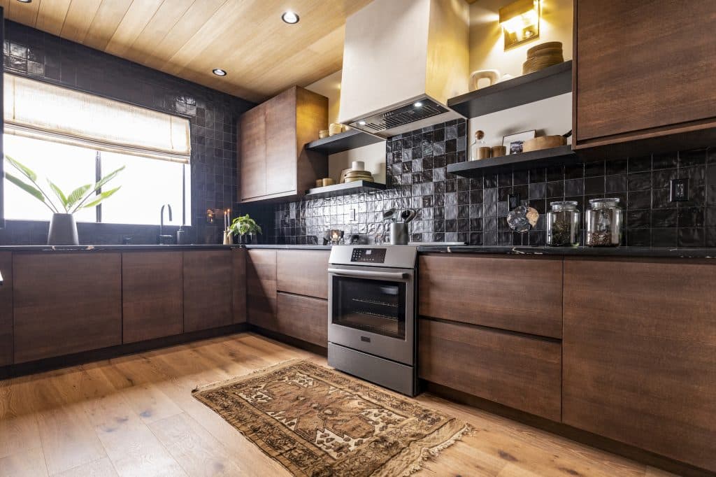 The fruit-patterned wallpaper and dated features in the old kitchen weren’t exactly Mark’s style. We brought his personality in with “rich and sexy” updates like dark cabinetry, updated wood floors, and black tile with a hand-crafted feel. One tile even has a special note from Julianne on the back!