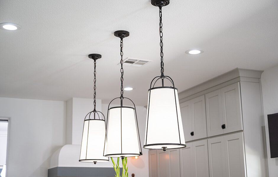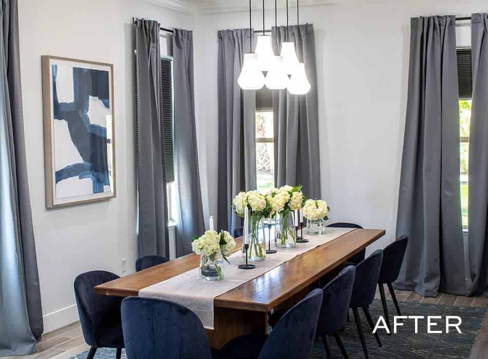 Charisma and Eric loved their home’s high ceilings, even if they made changing the smoke detector batteries a pain. The key here was to provide finishes that capitalized on the grandeur: window treatments that stretched well above the windows all the way to the floor, and a chandelier that provided a modern play on a traditional shape.