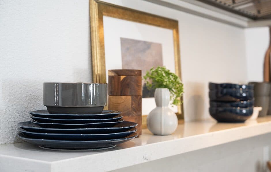 We installed a new electric fireplace and built-ins in the living room, and we really wanted to make each feature stand out. This sleek, beautiful tile reminds everyone—including the kids—that this is a grown-up space for entertaining and relaxation. Meanwhile, the mantle is a new, torch-aged piece of Douglas fir that presents a timeless look without requiring us to scavenge for expensive barnwood. And to make sure every family member enjoyed the room, we created a special space for the family dog to the right of the fireplace—look closely and you’ll see the dog bed!