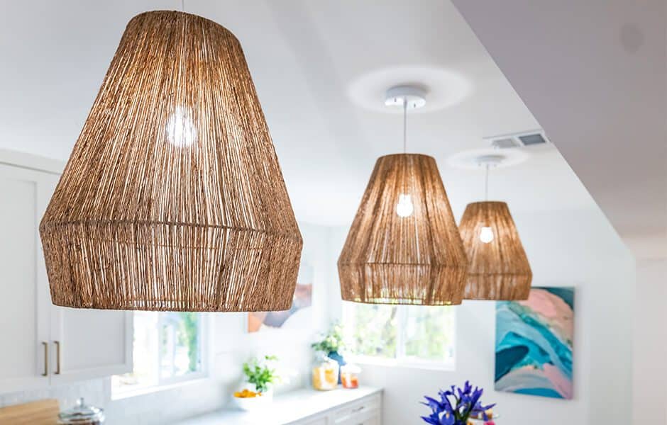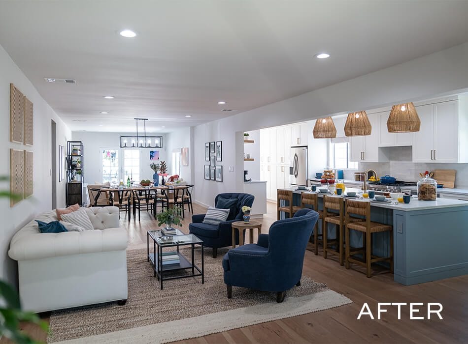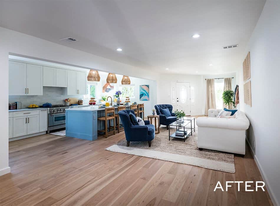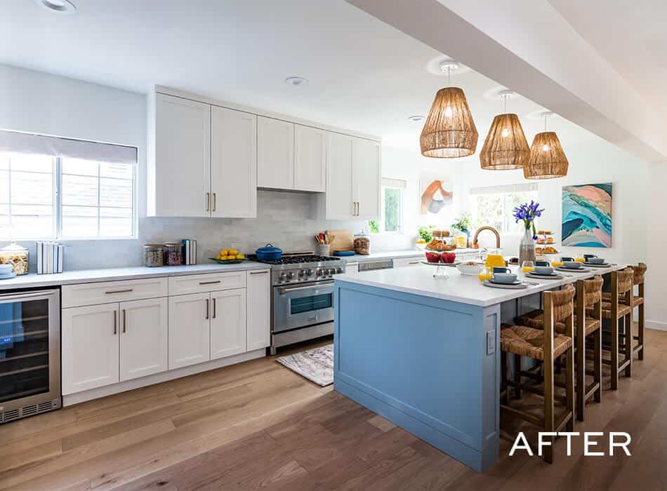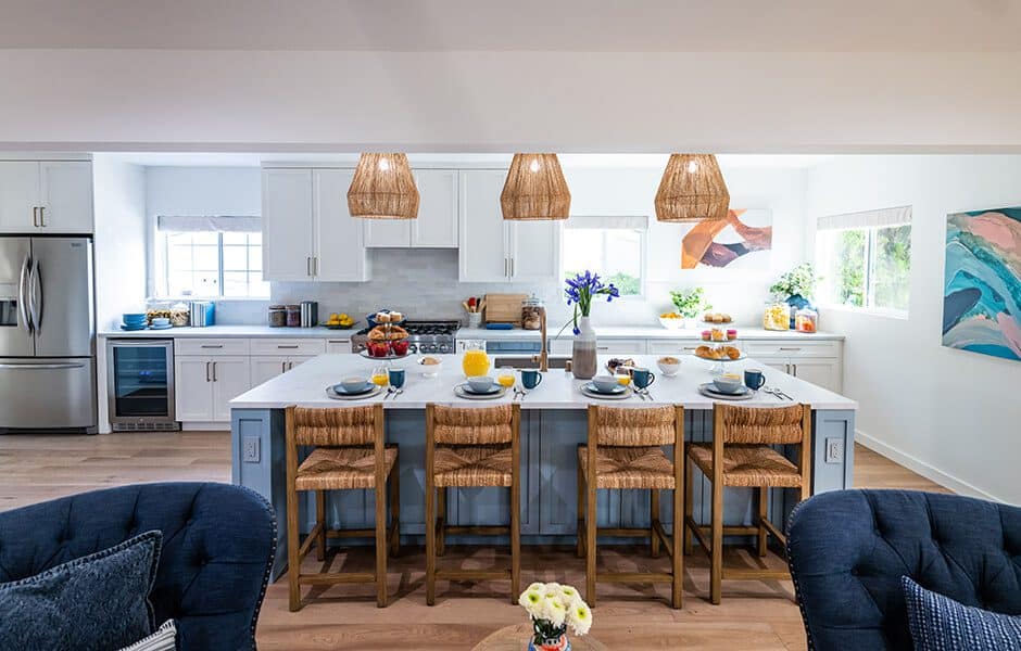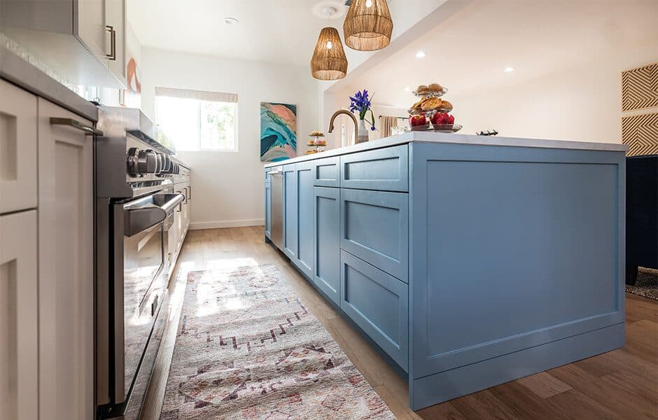 Two-tone cabinets were the order of the day for Cristina, so we introduced this blue into the home, combined with complementary art pieces placed throughout the space. Color doesn’t have to be overwhelming in a new design, especially when done thoughtfully and spread out across the layout.